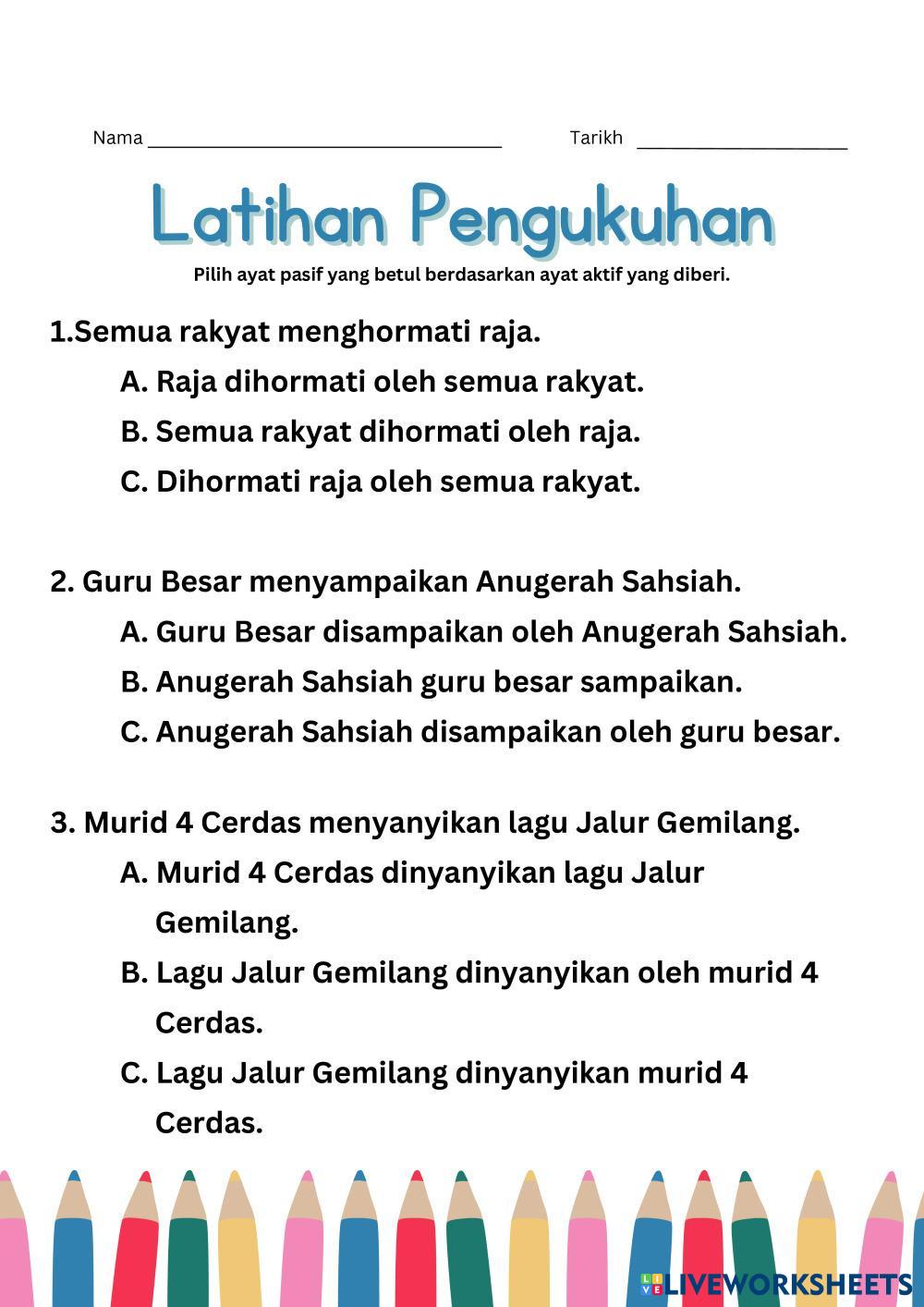 Created byAmysha Nadjwa Bahasa Melayu (BM) Tatabahasa Age 10-13 level: 3 Malay Author's Instructions My Google Classroom Courses × 0 classes selected (0 students total) Quick Access Select all classes (0 classes) All Classes Loading courses... Cancel Share Share to selected Course __COURSE_NAME__ __STUDENT_NAME__ (__STUDENT_EMAIL__) AYAT PASIF 5 Download Worksheet Validation Check my answers Emails my answers to my teacher Full name Group/level School subject Teacher's email or key code Close Submit Validating worksheet... (12) Your answers have been sent to your teacher. Good luck! OK We encountered an error submitting your answers. Please try again. OK Advertisement | Go Ad Free Created byAmysha Nadjwa Bahasa Melayu (BM) Tatabahasa Age 10-13 level: 3 Malay Author's Instructions