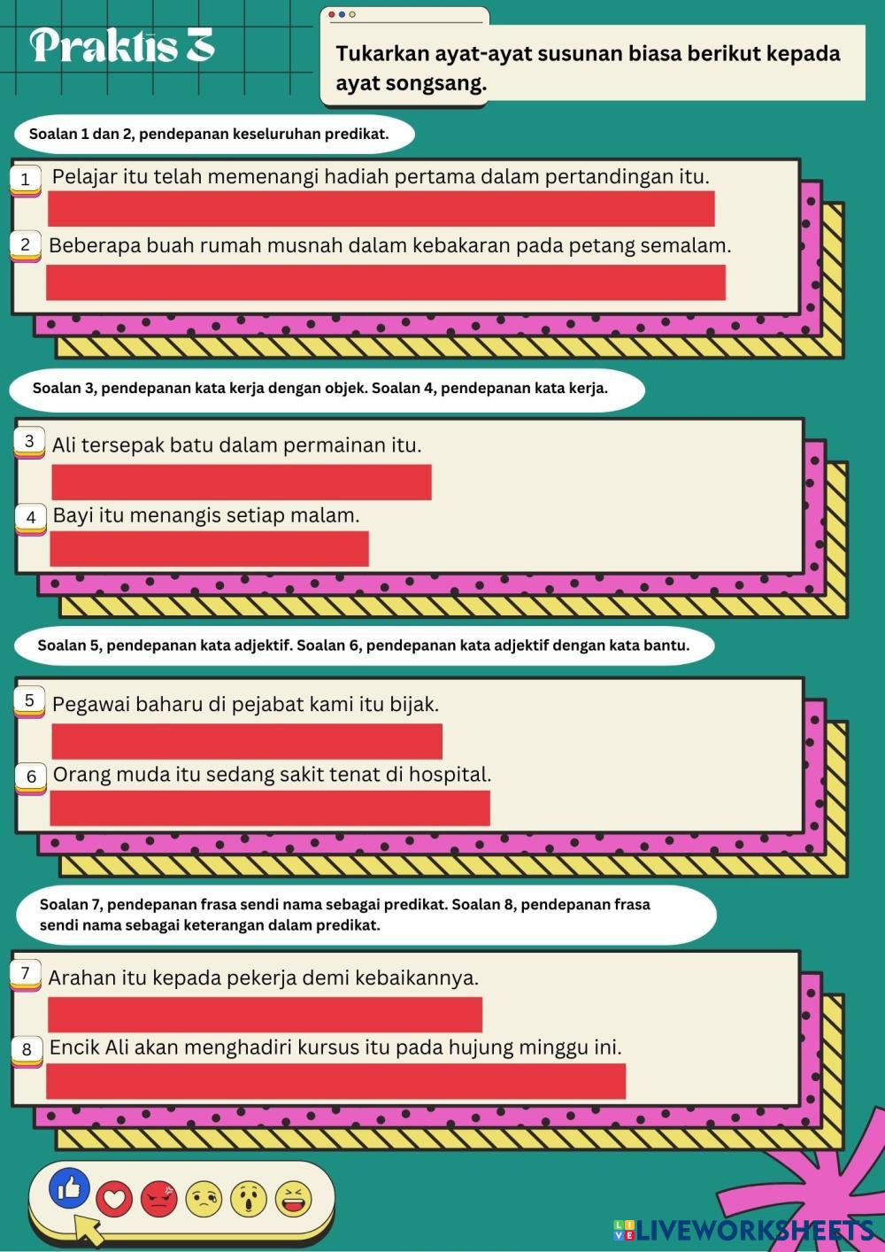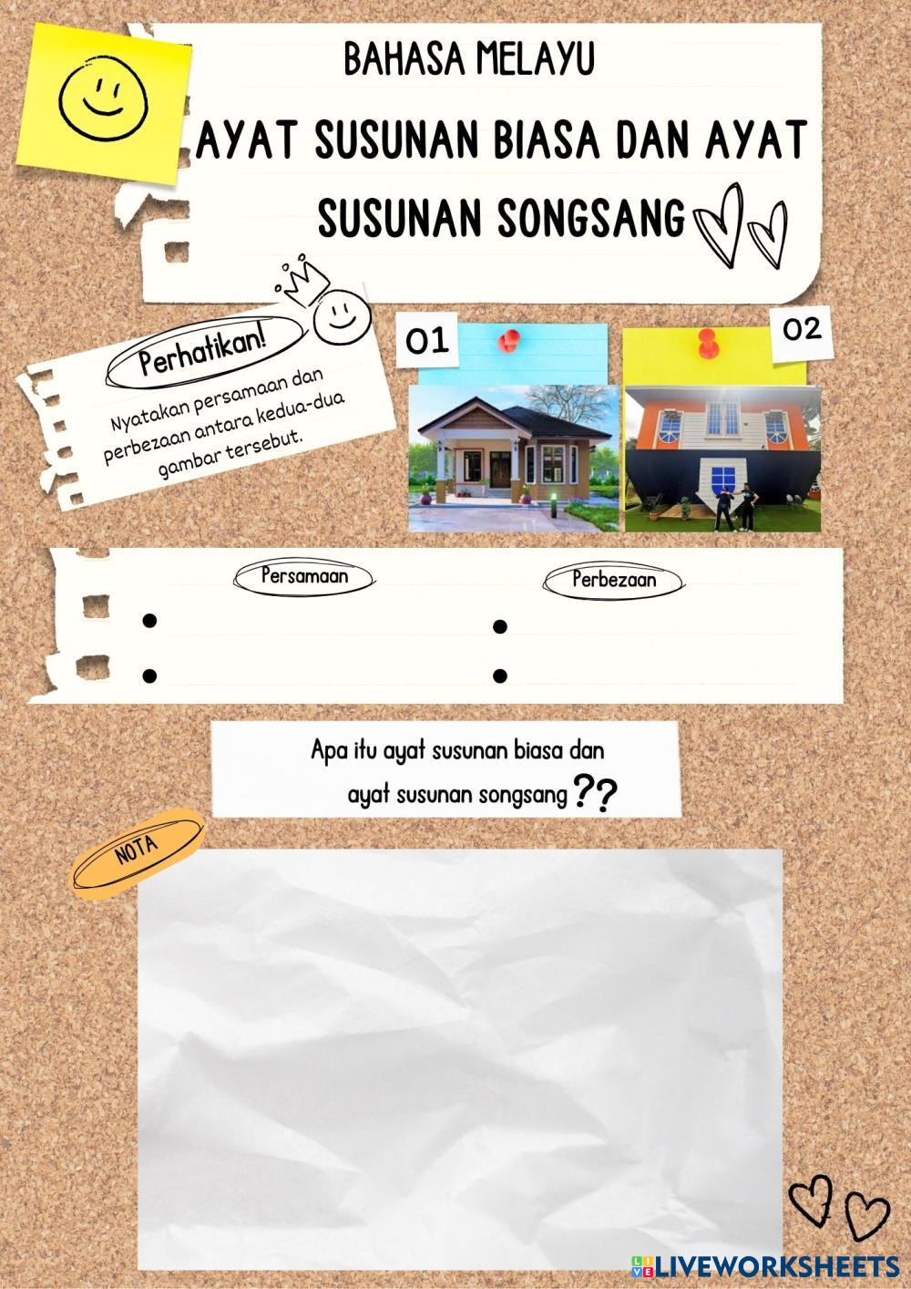 Created byMUHAMMAD ASHRAF ADZHA BIN ISMAIL Bahasa Melayu (BM) Ayat susunan biasa dan ayat susunan songsang Age 13+ level: SPM Malay Author's Instructions My Google Classroom Courses × 0 classes selected (0 students total) Quick Access Select all classes (0 classes) All Classes Loading courses... Cancel Share Share to selected Course __COURSE_NAME__ __STUDENT_NAME__ (__STUDENT_EMAIL__) AcapDeha Download Worksheet Validation Check my answers Emails my answers to my teacher Full name Group/level School subject Teacher's email or key code Close Submit Validating worksheet... (12) Your answers have been sent to your teacher. Good luck! OK We encountered an error submitting your answers. Please try again. OK Advertisement | Go Ad Free Created byMUHAMMAD ASHRAF ADZHA BIN ISMAIL Bahasa Melayu (BM) Ayat susunan biasa dan ayat susunan songsang Age 13+ level: SPM Malay Author's Instructions