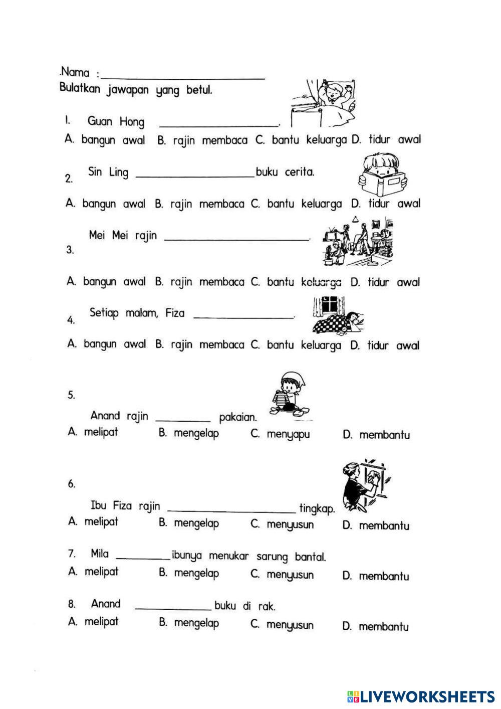 Created by kwy ESL Malay A1 Grammar Malay Author's Instructions Jawab semua soalan. My Google Classroom Courses × 0 classes selected (0 students total) Quick Access Select all classes (0 classes) All Classes Loading courses... Cancel Share Share to selected Course __COURSE_NAME__ __STUDENT_NAME__ (__STUDENT_EMAIL__) latihan ulangkaji Download Worksheet Validation Check my answers Emails my answers to my teacher Full name Group/level School subject Teacher's email or key code Close Submit Validating worksheet... (12) Your answers have been sent to your teacher. Good luck! OK We encountered an error submitting your answers. Please try again. OK Advertisement | Go Ad Free Created by kwy ESL Malay A1 Grammar Malay Author's Instructions Jawab semua soalan. Explore Worksheets LATIHAN JUALBELI ESL A1 LATIHAN JUALBELI Grammar - ESL JAWAB SEMUA SOALAN DIBAWAH Unit 12 : Suku kata (kvkv) akhiran دو ESL A1 Unit 12 : Suku kata (kvkv) akhiran دو Grammar - ESL Suaikan gambar yang bersesuaian dengan suku kata KATA TANYA ESL A1 KATA TANYA Grammar - ESL Suaikan jawapan. Pilih jawapan yang betul. kata majmuk tahun 2 ESL A1 kata majmuk tahun 2 Grammar - ESL taipkan jawapan yang betul