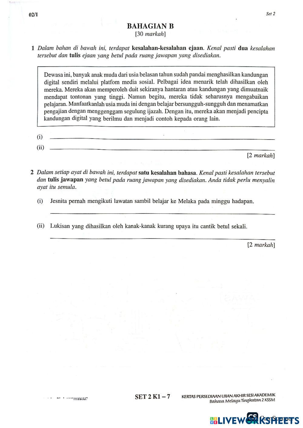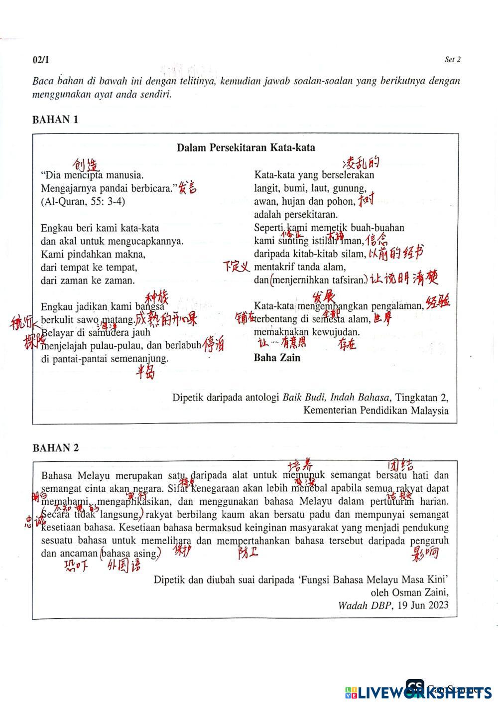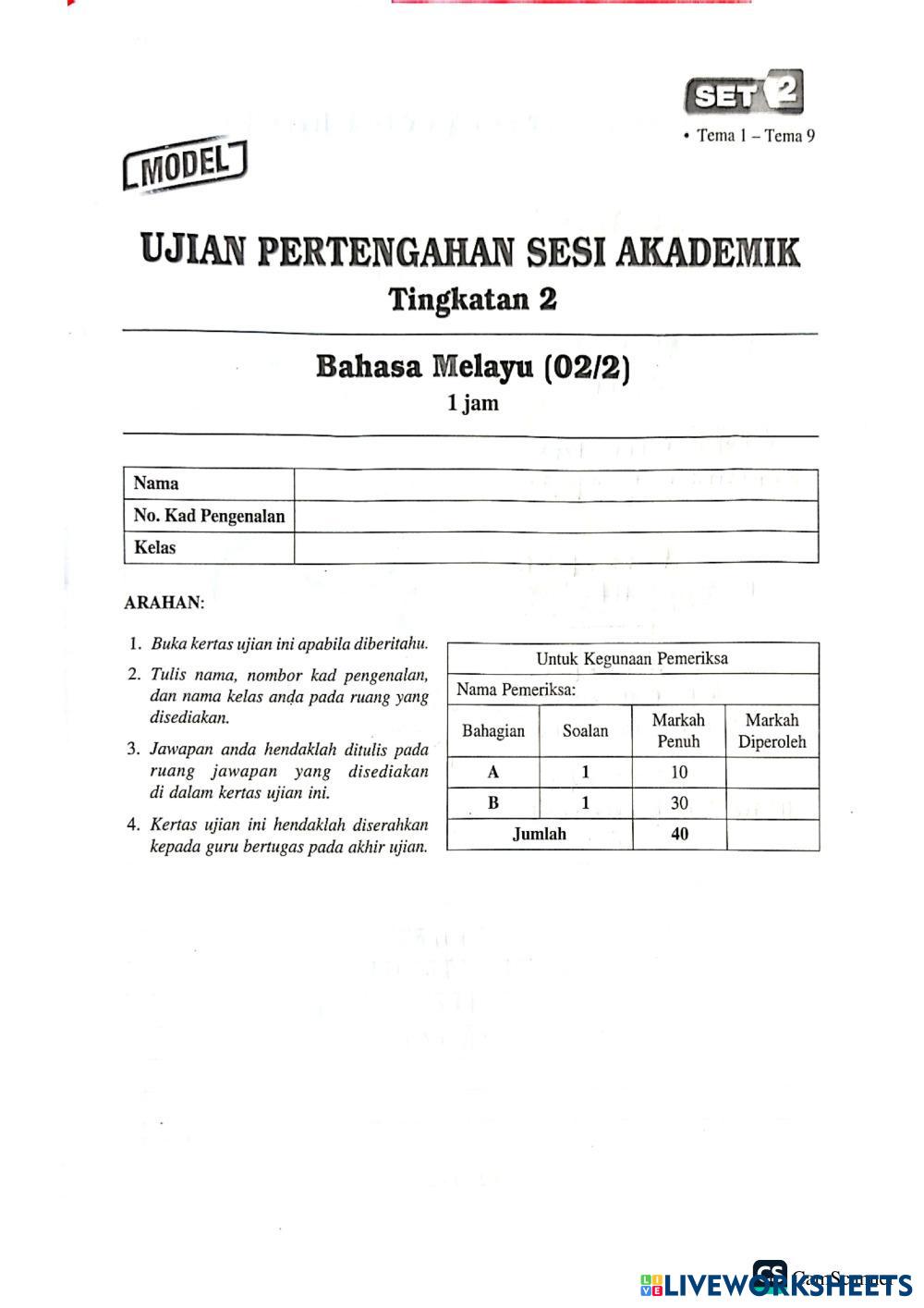 Created byhng winnie ESL Malay B1 Grammar Malay Author's Instructions Jawab soalan My Google Classroom Courses × 0 classes selected (0 students total) Quick Access Select all classes (0 classes) All Classes Loading courses... Cancel Share Share to selected Course __COURSE_NAME__ __STUDENT_NAME__ (__STUDENT_EMAIL__) T2 set 2 Bahagian B Sasbadi Download Worksheet Validation Check my answers Emails my answers to my teacher Full name Group/level School subject Teacher's email or key code Close Submit Validating worksheet... (12) Your answers have been sent to your teacher. Good luck! OK We encountered an error submitting your answers. Please try again. OK Advertisement | Go Ad Free Created byhng winnie ESL Malay B1 Grammar Malay Author's Instructions Jawab soalan Explore Worksheets T2 set 2 Soalan 1-15 Sasbadi ESL B1 T2 set 2 Soalan 1-15 Sasbadi Grammar - ESL Jawab soalan Kata adjektif bentuk ESL B1 Kata adjektif bentuk Grammar - ESL memahami kata adjektif bentuk T2 set 1 Bahagian B Sasbadi ESL B1 T2 set 1 Bahagian B Sasbadi Grammar - ESL Jawab soalan Peribahasa Tahun 4 ESL B1 Peribahasa Tahun 4 Grammar - ESL bBaca dan fahami soalan.kemudian padankan peribahasa dengan maksud