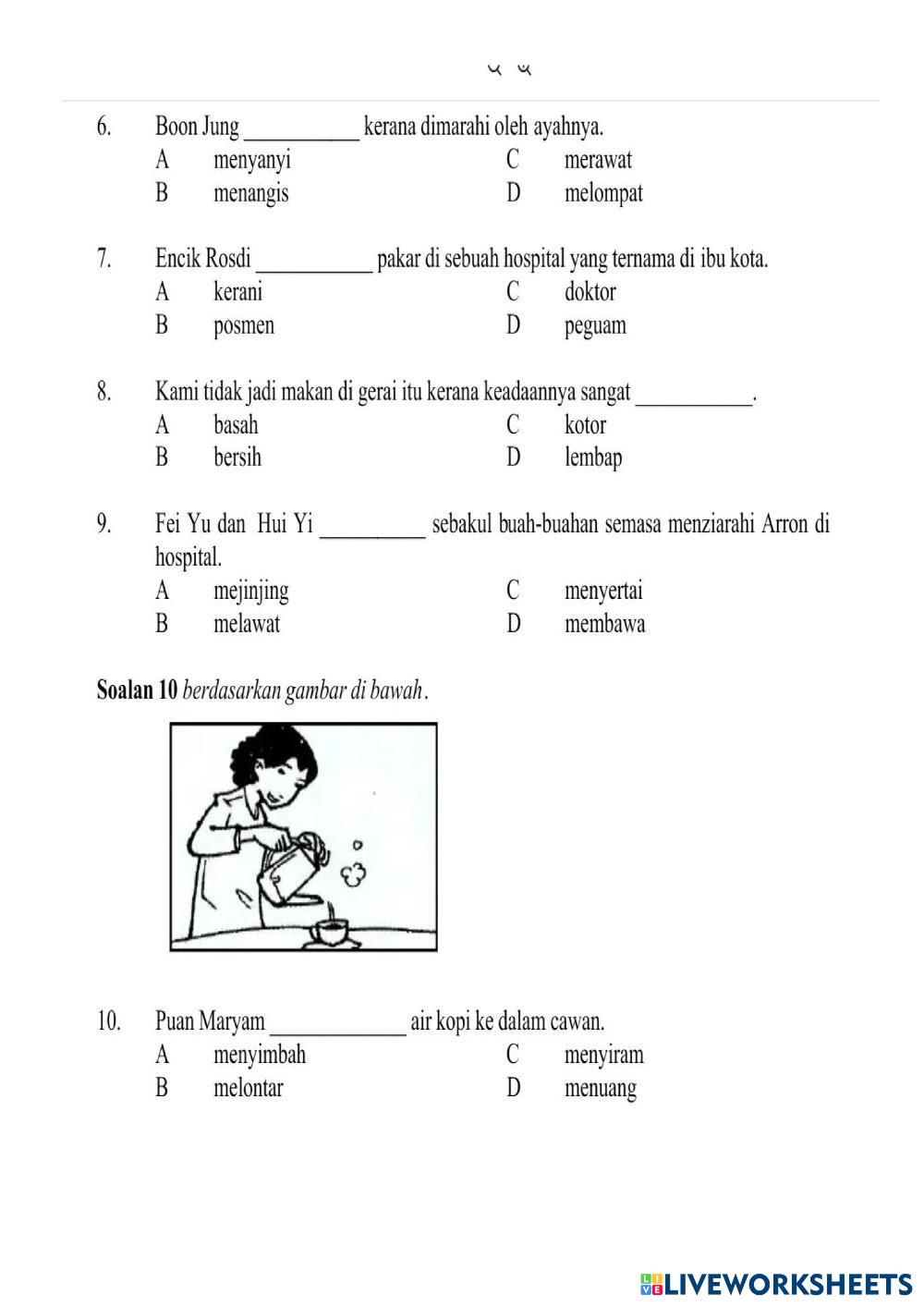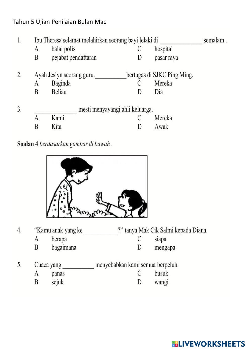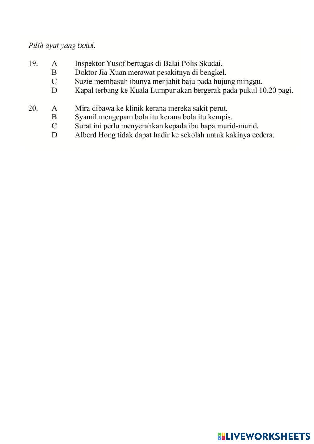 Created byhng winnie ESL Malay A2 Grammar Malay Author's Instructions Jawab soalan My Google Classroom Courses × 0 classes selected (0 students total) Quick Access Select all classes (0 classes) All Classes Loading courses... Cancel Share Share to selected Course __COURSE_NAME__ __STUDENT_NAME__ (__STUDENT_EMAIL__) Tahun 5 Ujian Penilaian Bulan Mac Download Worksheet Validation Check my answers Emails my answers to my teacher Full name Group/level School subject Teacher's email or key code Close Submit Validating worksheet... (12) Your answers have been sent to your teacher. Good luck! OK We encountered an error submitting your answers. Please try again. OK Advertisement | Go Ad Free Created byhng winnie ESL Malay A2 Grammar Malay Author's Instructions Jawab soalan Explore Worksheets Thn6 UASA全殿堂立德 model ms1-1=1-7_ ESL A2 Thn6 UASA全殿堂立德 model ms1-1=1-7_ Grammar - ESL Jawab soalan Tahun6 unit3 合力 ESL A2 Tahun6 unit3 合力 Grammar - ESL Jawab soalan Tahun6 unit1&2 合力 ESL A2 Tahun6 unit1&2 合力 Grammar - ESL Jawab soalan Cerialah Sahabatku ESL A2 Cerialah Sahabatku Grammar - ESL Lengkapkan Carta Alir