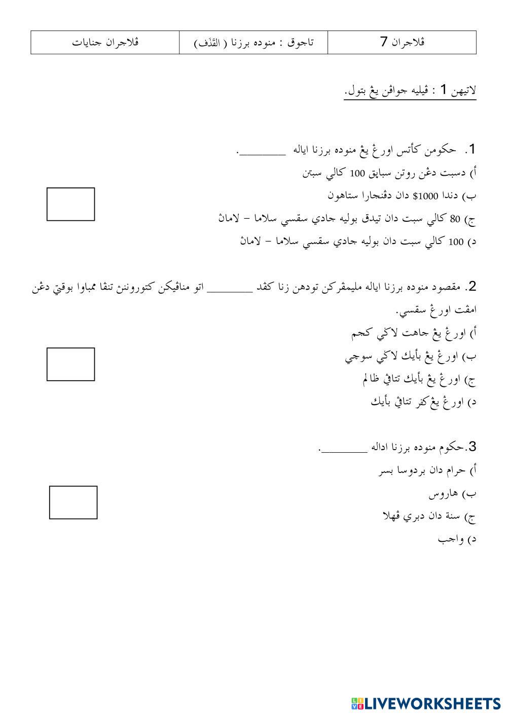 Created byKhallit Talib ESL Malay A1 Writing Malay Author's Instructions PILIH JAWAPAN YANG BETUL My Google Classroom Courses × 0 classes selected (0 students total) Quick Access Select all classes (0 classes) All Classes Loading courses... Cancel Share Share to selected Course __COURSE_NAME__ __STUDENT_NAME__ (__STUDENT_EMAIL__) LATIHAN 1 JENAYAT DARJAH 6 TAJUK MENUDUH BERZINA Download Worksheet Validation Check my answers Emails my answers to my teacher Full name Group/level School subject Teacher's email or key code Close Submit Validating worksheet... (12) Your answers have been sent to your teacher. Good luck! OK We encountered an error submitting your answers. Please try again. OK Advertisement | Go Ad Free Created byKhallit Talib ESL Malay A1 Writing Malay Author's Instructions PILIH JAWAPAN YANG BETUL Explore Worksheets LATIHAN 1 AMALI AGAMA DARJAH 5 TAJUK SOLAT QASAR DAN JAMAK ESL A1 LATIHAN 1 AMALI AGAMA DARJAH 5 TAJUK SOLAT QASAR DAN JAMAK Writing - ESL WORD SEARCH LATIHAN 1 MUNAKAHAT DARJAH 6 TAJUK WALI ESL A1 LATIHAN 1 MUNAKAHAT DARJAH 6 TAJUK WALI Writing - ESL PILIH JAWAPAN YANG BETUL LATIHAN 2 JENAYAT DARJAH 6 TAJUK MENUDUH BERZINA ESL A1 LATIHAN 2 JENAYAT DARJAH 6 TAJUK MENUDUH BERZINA Writing - ESL PILIH JAWAPAN YANG BETUL LATIHAN 2 HAJI UMRAH DARJAH 6 TAJUK TAHALUL ESL A1 LATIHAN 2 HAJI UMRAH DARJAH 6 TAJUK TAHALUL Writing - ESL PILIH JAWAPAN YANG BETUL