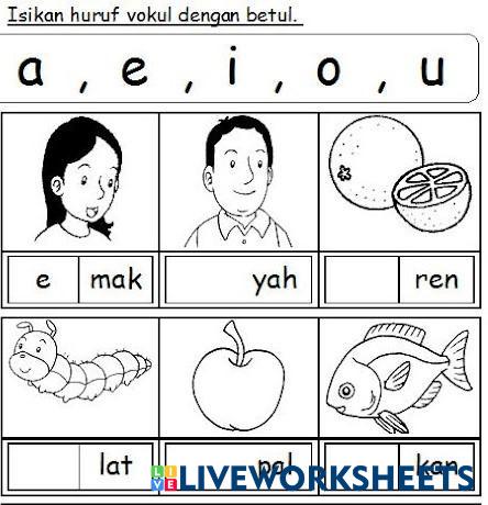 MURID DIMINTA ISI TEMPAT KOSONG DENGAN VOKAL YANG BETUL. SILA DRAGKAN JAWAPAN DI DALAM KOTAK YANG DISEDIAKAN