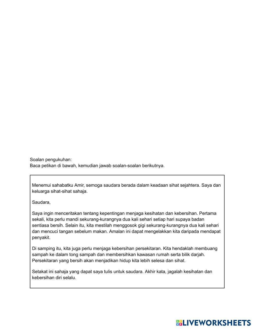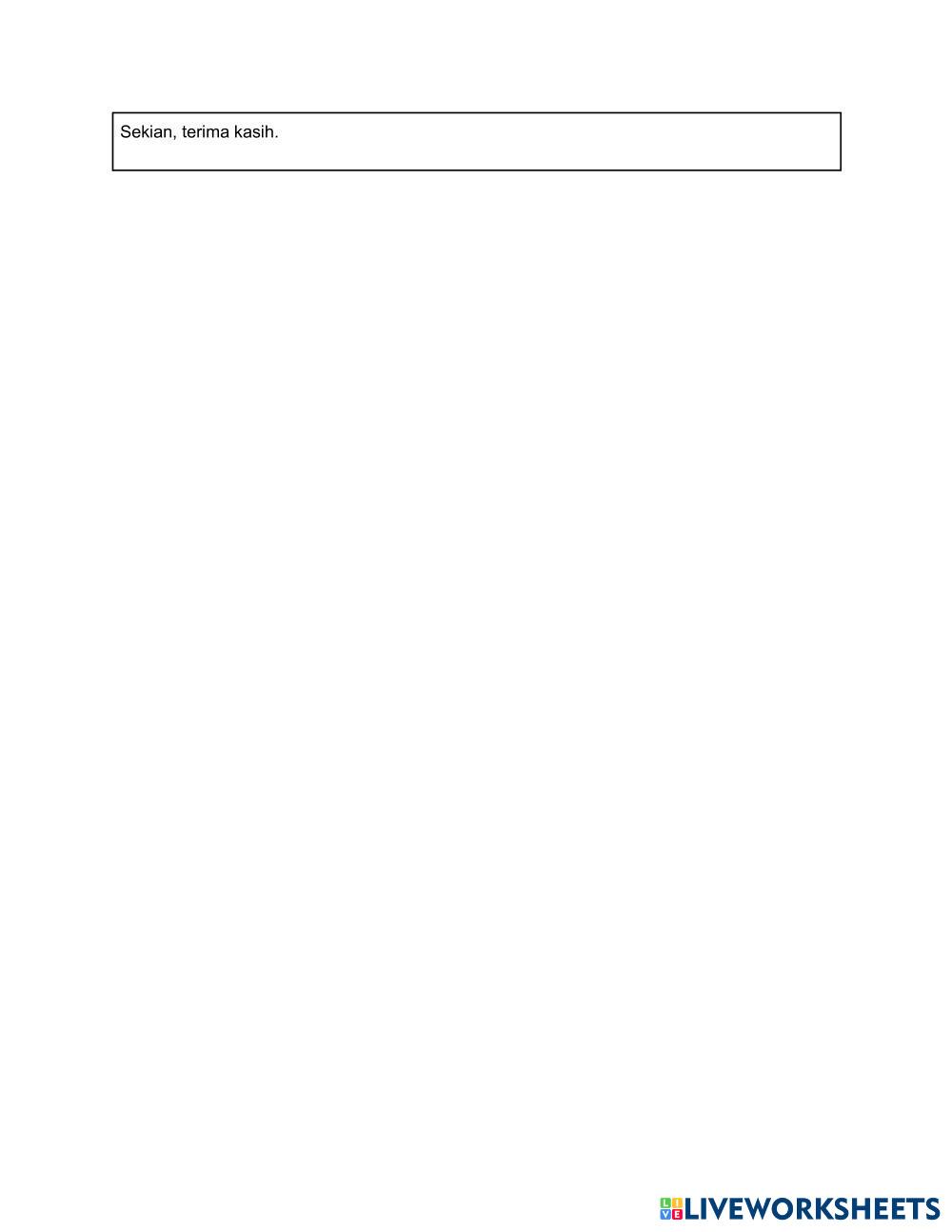 Created by naminasir ESL Malay B2 Writing Malay Author's Instructions Soalan pemahaman: Berdasarkan teks, jawab soalan-soalan berikut. My Google Classroom Courses × 0 classes selected (0 students total) Quick Access Select all classes (0 classes) All Classes Loading courses... Cancel Share Share to selected Course __COURSE_NAME__ __STUDENT_NAME__ (__STUDENT_EMAIL__) Latihan pengukuhan Download Worksheet Validation Check my answers Emails my answers to my teacher Full name Group/level School subject Teacher's email or key code Close Submit Validating worksheet... (12) Your answers have been sent to your teacher. Good luck! OK We encountered an error submitting your answers. Please try again. OK Advertisement | Go Ad Free Created by naminasir ESL Malay B2 Writing Malay Author's Instructions Soalan pemahaman: Berdasarkan teks, jawab soalan-soalan berikut. Explore Worksheets LATIHAN ZAKAT ( ZAKAT FITRAH) ESL B2 LATIHAN ZAKAT ( ZAKAT FITRAH) Writing - ESL Jawab semua soalan yang diberikan. LATIHAN PENGENALAN JENAYAT ESL B2 LATIHAN PENGENALAN JENAYAT Writing - ESL Jawap semua soalan yang diberikan. LATIHAN MUNAKAHAT ESL B2 LATIHAN MUNAKAHAT Writing - ESL JAWAB SEMUA SOALAN DI BAWAH ULANG KAJI DIALEK MELAYU BRUNEI ESL B2 ULANG KAJI DIALEK MELAYU BRUNEI Writing - ESL Isikan tempat kosong dengan dialek Melayu Brunei atau maksud dialek dengan jawapan yang betul.