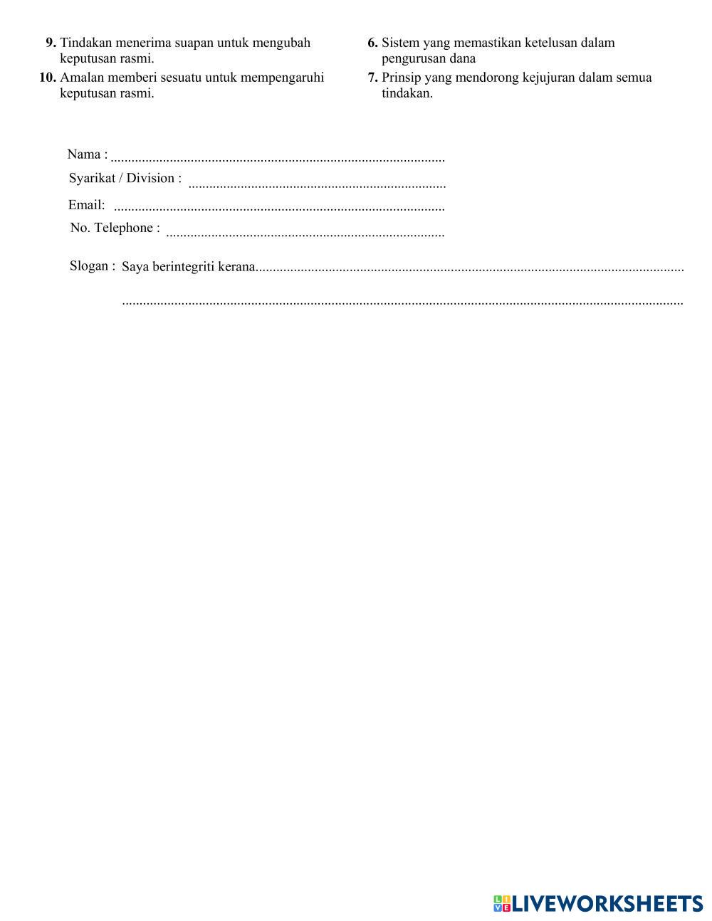 Created by cikguhafizadam Integrity Crosswork Age 18+ level: 1 Malay Author's Instructions My Google Classroom Courses × 0 classes selected (0 students total) Quick Access Select all classes (0 classes) All Classes Loading courses... Cancel Share Share to selected Course __COURSE_NAME__ __STUDENT_NAME__ (__STUDENT_EMAIL__) Crossword Game - Integrity Day 2024 Download Worksheet Validation Check my answers Emails my answers to my teacher Full name Group/level School subject Teacher's email or key code Close Submit Validating worksheet... (12) Your answers have been sent to your teacher. Good luck! OK We encountered an error submitting your answers. Please try again. OK Advertisement | Go Ad Free Created by cikguhafizadam Integrity Crosswork Age 18+ level: 1 Malay Author's Instructions
