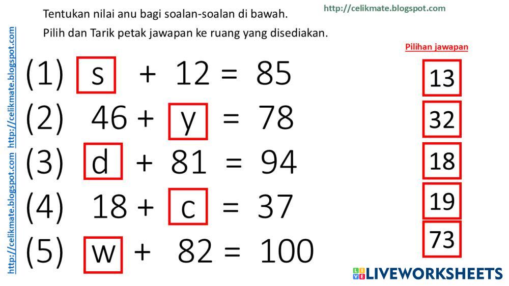 1.8.1 Menentukan nilai anu bagi ayat matematik tambah melibatkan dua nombor hingga dua digit dengan satu anu.