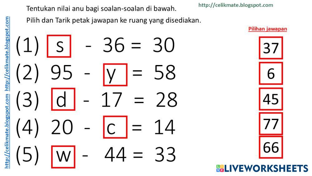Created by CikguNisak Matematik 1.8 Penggunaan anu Age 10-15 level: Tahun 4 Malay Author's Instructions My Google Classroom Courses × 0 classes selected (0 students total) Quick Access Select all classes (0 classes) All Classes Loading courses... Cancel Share Share to selected Course __COURSE_NAME__ __STUDENT_NAME__ (__STUDENT_EMAIL__) 1.8.2 Menentukan Nilai Anu Bagi Ayat Matematik Tolak Melibatkan Dua Nombor Hingga Dua Digit Dengan Satu Anu. Download Worksheet Validation Check my answers Emails my answers to my teacher Full name Group/level School subject Teacher's email or key code Close Submit Validating worksheet... (12) Your answers have been sent to your teacher. Good luck! OK We encountered an error submitting your answers. Please try again. OK Advertisement | Go Ad Free Created by CikguNisak Matematik 1.8 Penggunaan anu Age 10-15 level: Tahun 4 Malay Author's Instructions