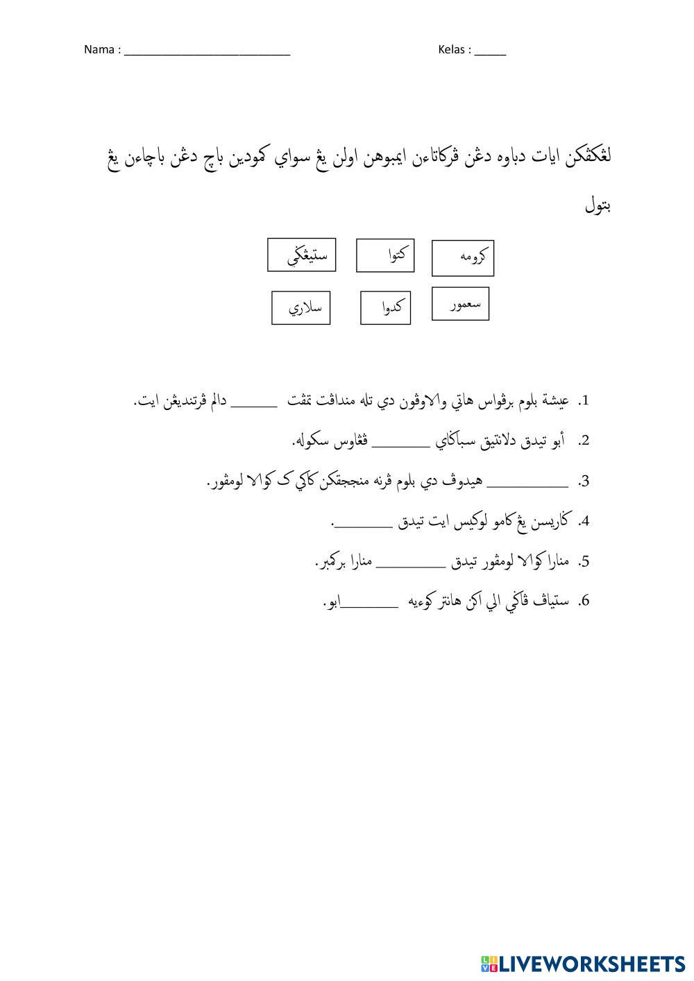 Created by fareez_ PENDIDIKAN ISLAM Jawi Age 7-12 level: primary Malay Author's Instructions My Google Classroom Courses × 0 classes selected (0 students total) Quick Access Select all classes (0 classes) All Classes Loading courses... Cancel Share Share to selected Course __COURSE_NAME__ __STUDENT_NAME__ (__STUDENT_EMAIL__) Imbuhan awalan se ke di Download Worksheet Validation Check my answers Emails my answers to my teacher Full name Group/level School subject Teacher's email or key code Close Submit Validating worksheet... (12) Your answers have been sent to your teacher. Good luck! OK We encountered an error submitting your answers. Please try again. OK Advertisement | Go Ad Free Created by fareez_ PENDIDIKAN ISLAM Jawi Age 7-12 level: primary Malay Author's Instructions