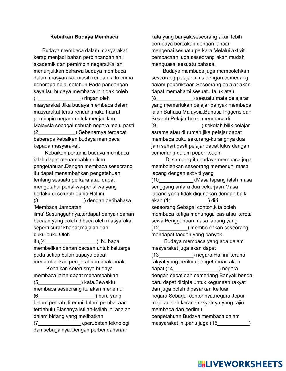 Created byKhoo Yeon Chen Social Studies Middle School 6th grade Community and Culture Malay Author's Instructions KARANGAN My Google Classroom Courses × 0 classes selected (0 students total) Quick Access Select all classes (0 classes) All Classes Loading courses... Cancel Share Share to selected Course __COURSE_NAME__ __STUDENT_NAME__ (__STUDENT_EMAIL__) BM PENULISAN PRAKTIS 3 Download Worksheet Validation Check my answers Emails my answers to my teacher Full name Group/level School subject Teacher's email or key code Close Submit Validating worksheet... (12) Your answers have been sent to your teacher. Good luck! OK We encountered an error submitting your answers. Please try again. OK Advertisement | Go Ad Free Created byKhoo Yeon Chen Social Studies Middle School 6th grade Community and Culture Malay Author's Instructions KARANGAN Explore Worksheets Fiche 03. La mélodie Social Studies 6th grade Fiche 03. La mélodie Community and Culture - Social Studies Complète BM PT3 PRAKTIS 223 Social Studies 6th grade BM PT3 PRAKTIS 223 Community and Culture - Social Studies TATABAHASA BM PT3 PRAKTIS 222 Social Studies 6th grade BM PT3 PRAKTIS 222 Community and Culture - Social Studies BAHAGIAN A BM PT3 PRAKTIS 221 Social Studies 6th grade BM PT3 PRAKTIS 221 Community and Culture - Social Studies TATABAHASA