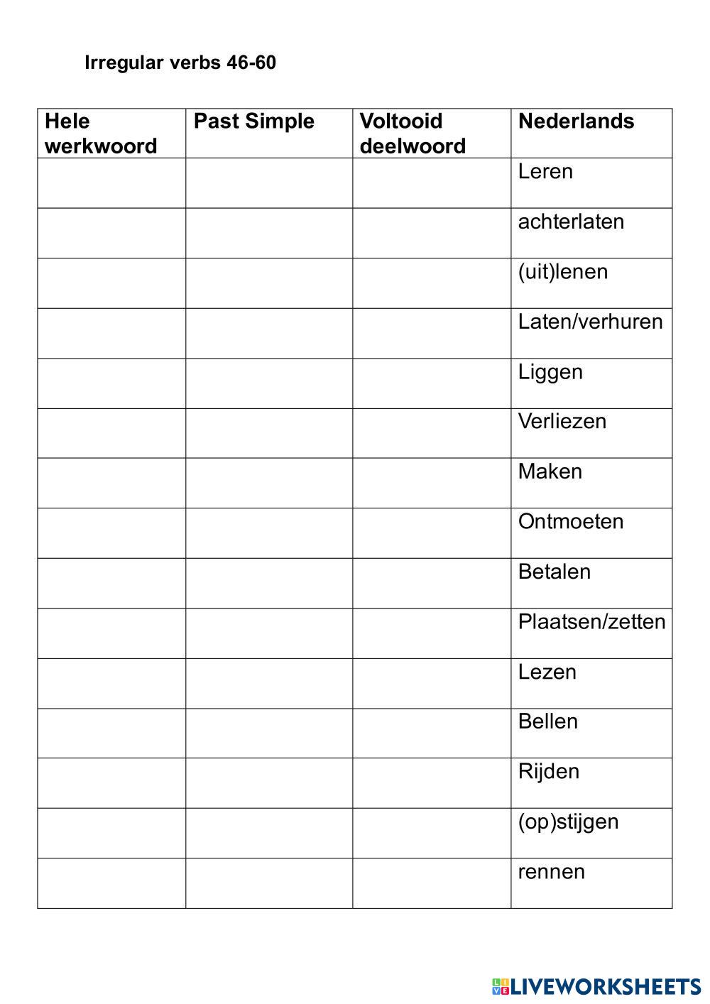 Created byAdmin (LW Team) English Irregular verbs Age 13+ level: 2-3-4 mavo Dutch Author's Instructions My Google Classroom Courses × 0 classes selected (0 students total) Quick Access Select all classes (0 classes) All Classes Loading courses... Cancel Share Share to selected Course __COURSE_NAME__ __STUDENT_NAME__ (__STUDENT_EMAIL__) Irregular verbs 46-60 MAVO 3-4 Download Worksheet Validation Check my answers Emails my answers to my teacher Full name Group/level School subject Teacher's email or key code Close Submit Validating worksheet... (12) Your answers have been sent to your teacher. Good luck! OK We encountered an error submitting your answers. Please try again. OK Advertisement | Go Ad Free Created byAdmin (LW Team) English Irregular verbs Age 13+ level: 2-3-4 mavo Dutch Author's Instructions