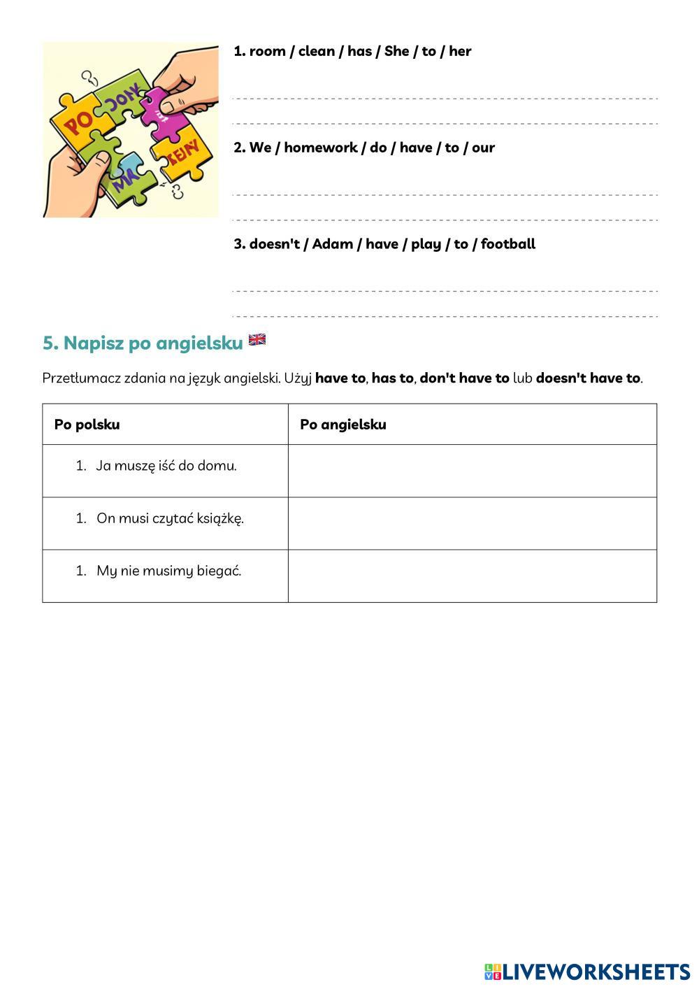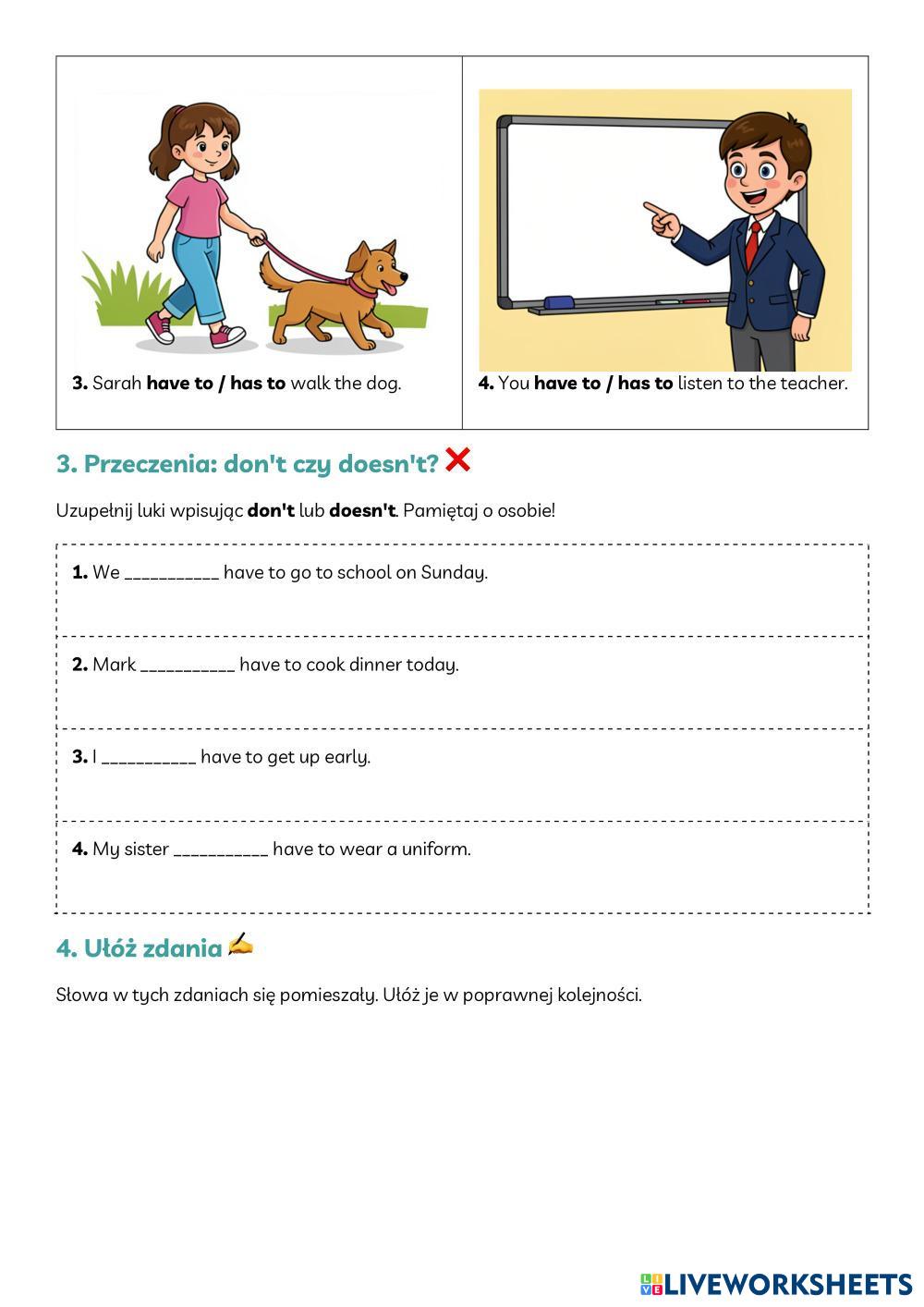 Created byMagdalena Wiórkowska English Language Middle School 6th grade Grammar Polish Author's Instructions wykonaj zadania My Google Classroom Courses × 0 classes selected (0 students total) Quick Access Select all classes (0 classes) All Classes Loading courses... Cancel Share Share to selected Course __COURSE_NAME__ __STUDENT_NAME__ (__STUDENT_EMAIL__) Have to has to Download Worksheet Validation Check my answers Emails my answers to my teacher Full name Group/level School subject Teacher's email or key code Close Submit Validating worksheet... (12) Your answers have been sent to your teacher. Good luck! OK We encountered an error submitting your answers. Please try again. OK Advertisement | Go Ad Free Created byMagdalena Wiórkowska English Language Middle School 6th grade Grammar Polish Author's Instructions wykonaj zadania Explore Worksheets Grammar: Need and Want English Language 6th grade Grammar: Need and Want Grammar - English Language Complete the sentences using the infitive form of "need" and "want." SISFA Intensive Exam 1 English Language 6th grade SISFA Intensive Exam 1 Grammar - English Language Read and answer has to- have to English Language 6th grade has to- have to Grammar - English Language Choose the correct answer Find and correct the mistakes( 4 tenses) English Language 6th grade Find and correct the mistakes( 4 tenses) Grammar - English Language Find and correct the mistakes( 4 tenses)