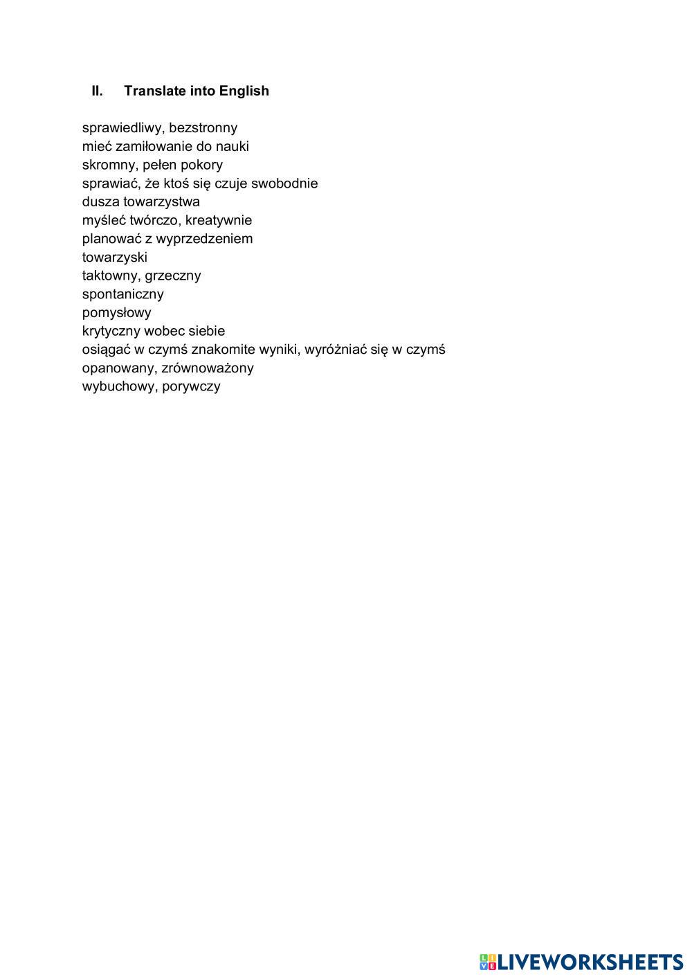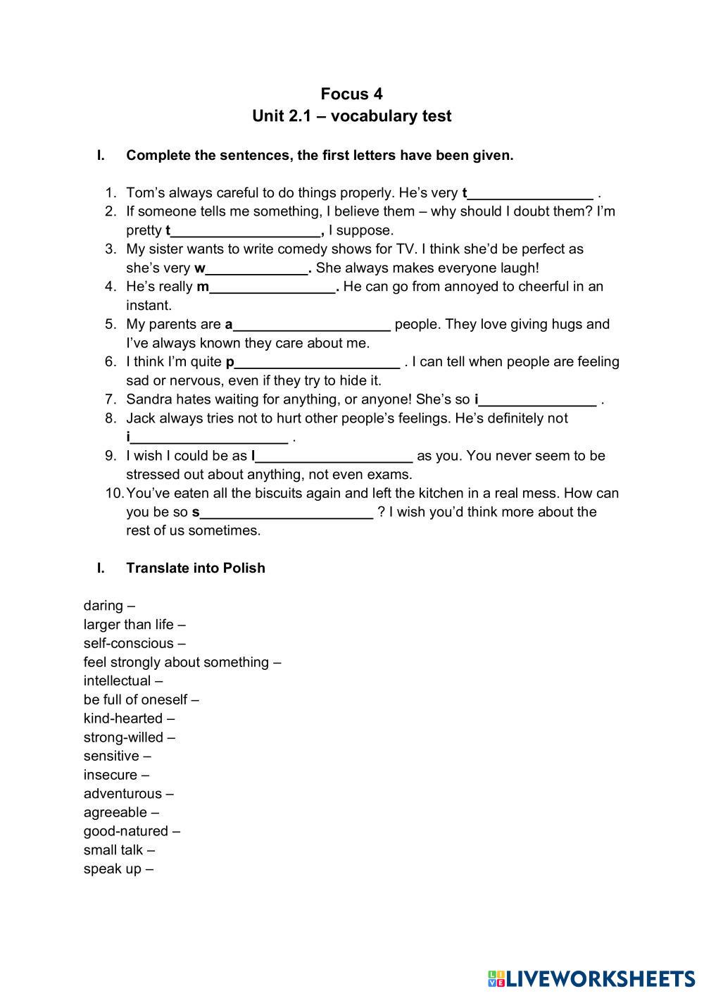Created by Aneta345 English Language High School 10th grade Vocabulary Polish Author's Instructions Follow the instructions My Google Classroom Courses × 0 classes selected (0 students total) Quick Access Select all classes (0 classes) All Classes Loading courses... Cancel Share Share to selected Course __COURSE_NAME__ __STUDENT_NAME__ (__STUDENT_EMAIL__) Focus 4 vocab 2.1 Download Worksheet Validation Check my answers Emails my answers to my teacher Full name Group/level School subject Teacher's email or key code Close Submit Validating worksheet... (12) Your answers have been sent to your teacher. Good luck! OK We encountered an error submitting your answers. Please try again. OK Advertisement | Go Ad Free Created by Aneta345 English Language High School 10th grade Vocabulary Polish Author's Instructions Follow the instructions Explore Worksheets Word Stress Identification Activity English Language 10th grade Word Stress Identification Activity Vocabulary - English Language Listen to each word and choose the syllable that is stressed.Listen to each word and choose the syllable that is stressed. Vocabulary DD Unit 9 Getting started English Language 10th grade Vocabulary DD Unit 9 Getting started Vocabulary - English Language Hello Nature and Environment English Language 10th grade Nature and Environment Vocabulary - English Language Review Life Vision B1+ Unit 5 Test English Language 10th grade Life Vision B1+ Unit 5 Test Vocabulary - English Language Read the instructions and answer the test.