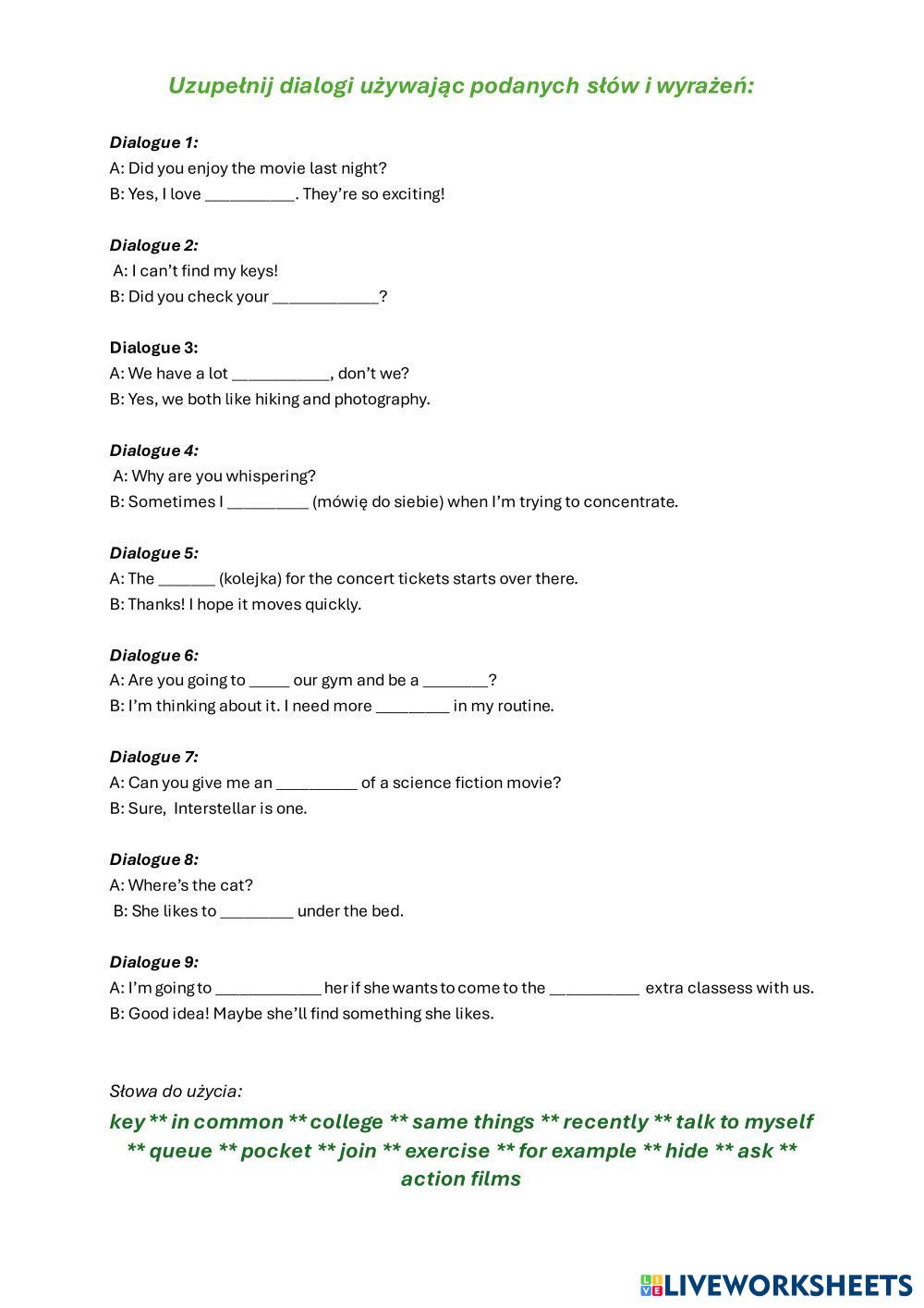 Created byAnita English as a Second Language (ESL) Vocabulary Age 17+ level: A1 Polish Author's Instructions My Google Classroom Courses × 0 classes selected (0 students total) Quick Access Select all classes (0 classes) All Classes Loading courses... Cancel Share Share to selected Course __COURSE_NAME__ __STUDENT_NAME__ (__STUDENT_EMAIL__) Vocabulary Download Worksheet Validation Check my answers Emails my answers to my teacher Full name Group/level School subject Teacher's email or key code Close Submit Validating worksheet... (12) Your answers have been sent to your teacher. Good luck! OK We encountered an error submitting your answers. Please try again. OK Advertisement | Go Ad Free Created byAnita English as a Second Language (ESL) Vocabulary Age 17+ level: A1 Polish Author's Instructions