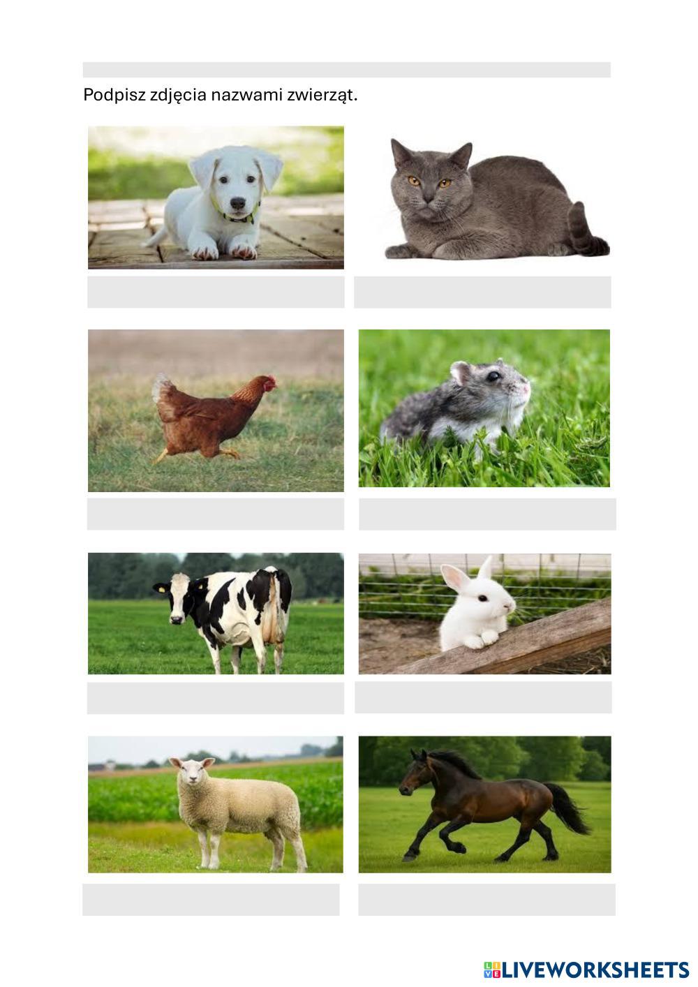 Karta pracy polegająca na podpisywaniu zdjęć zwierząt (nazywaniu ich).