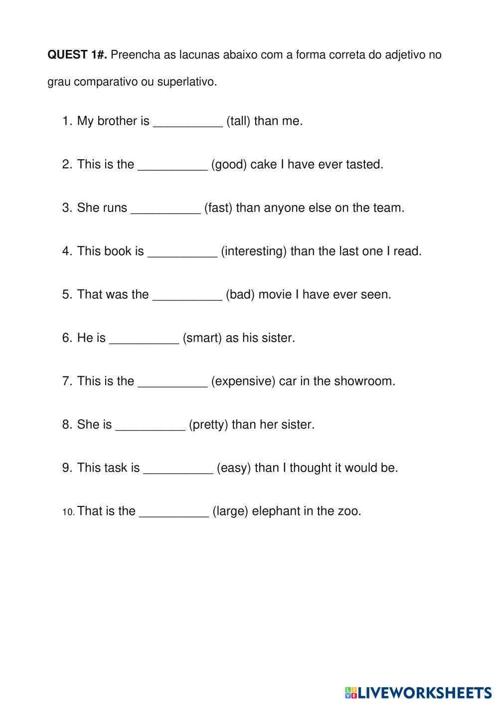 Nesta atividade, os alunos irão preencher as lacunas com a forma correta do adjetivo no comparativo ou superlativo. Isso ajudará a reforçar o entendimento deles sobre o uso do Comparative e Superlative em inglês.