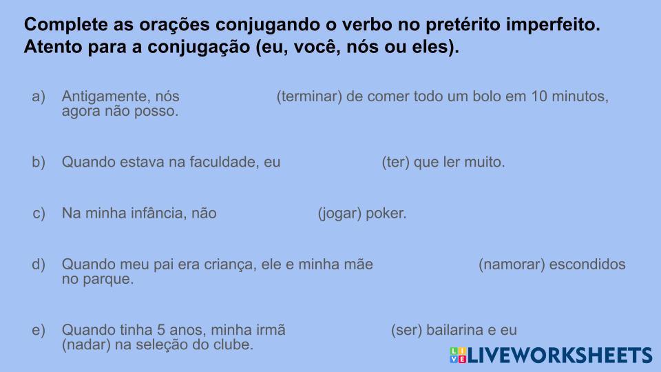 Created by cpugens Língua portuguesa Conjugação verbal Age 18+ level: Intermédio Portuguese Author's Instructions My Google Classroom Courses × 0 classes selected (0 students total) Quick Access Select all classes (0 classes) All Classes Loading courses... Cancel Share Share to selected Course __COURSE_NAME__ __STUDENT_NAME__ (__STUDENT_EMAIL__) Pretérito imperfeito Download Worksheet Validation Check my answers Emails my answers to my teacher Full name Group/level School subject Teacher's email or key code Close Submit Validating worksheet... (12) Your answers have been sent to your teacher. Good luck! OK We encountered an error submitting your answers. Please try again. OK Advertisement | Go Ad Free Created by cpugens Língua portuguesa Conjugação verbal Age 18+ level: Intermédio Portuguese Author's Instructions