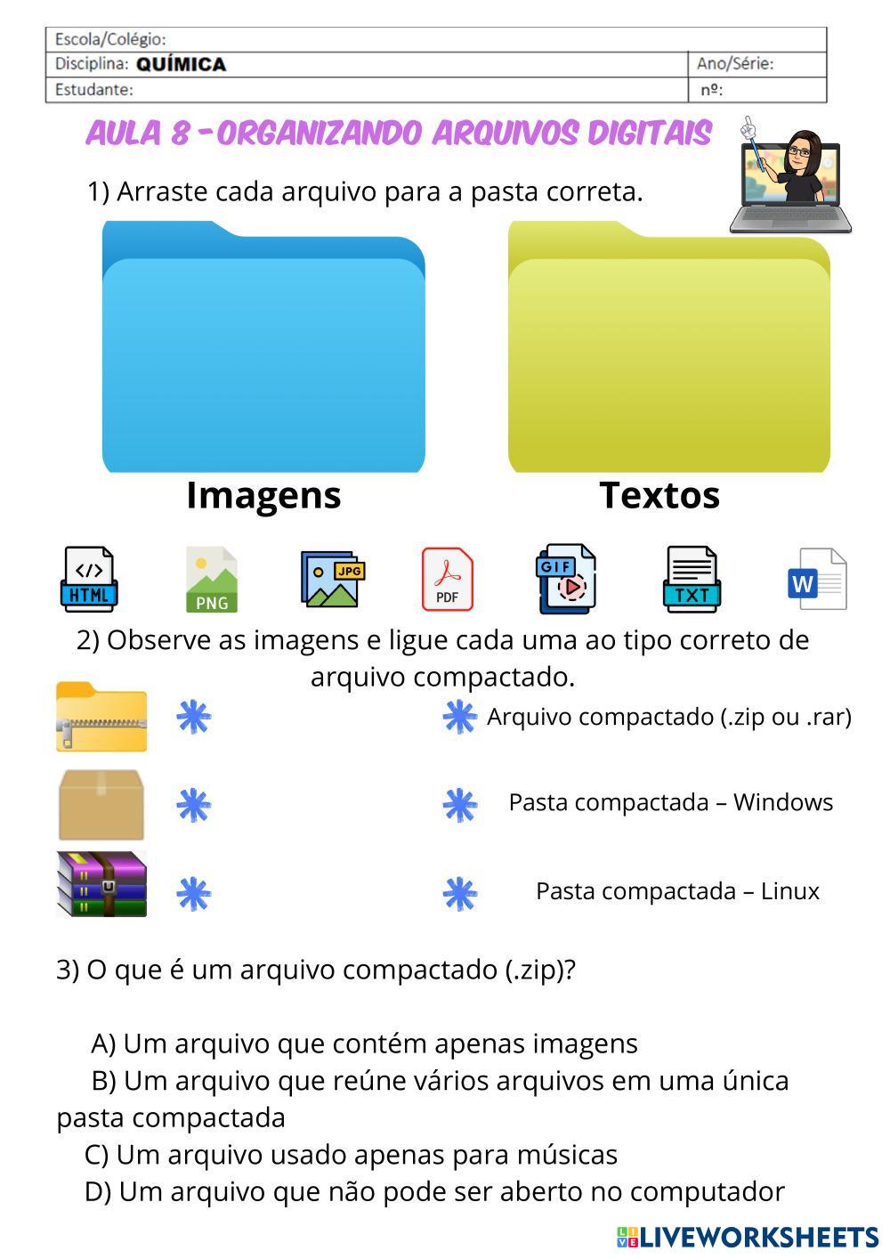 Nesta atividade, você irá praticar o que aprendeu sobre tipos de arquivos digitais, extensões e organização de arquivos no computador.
