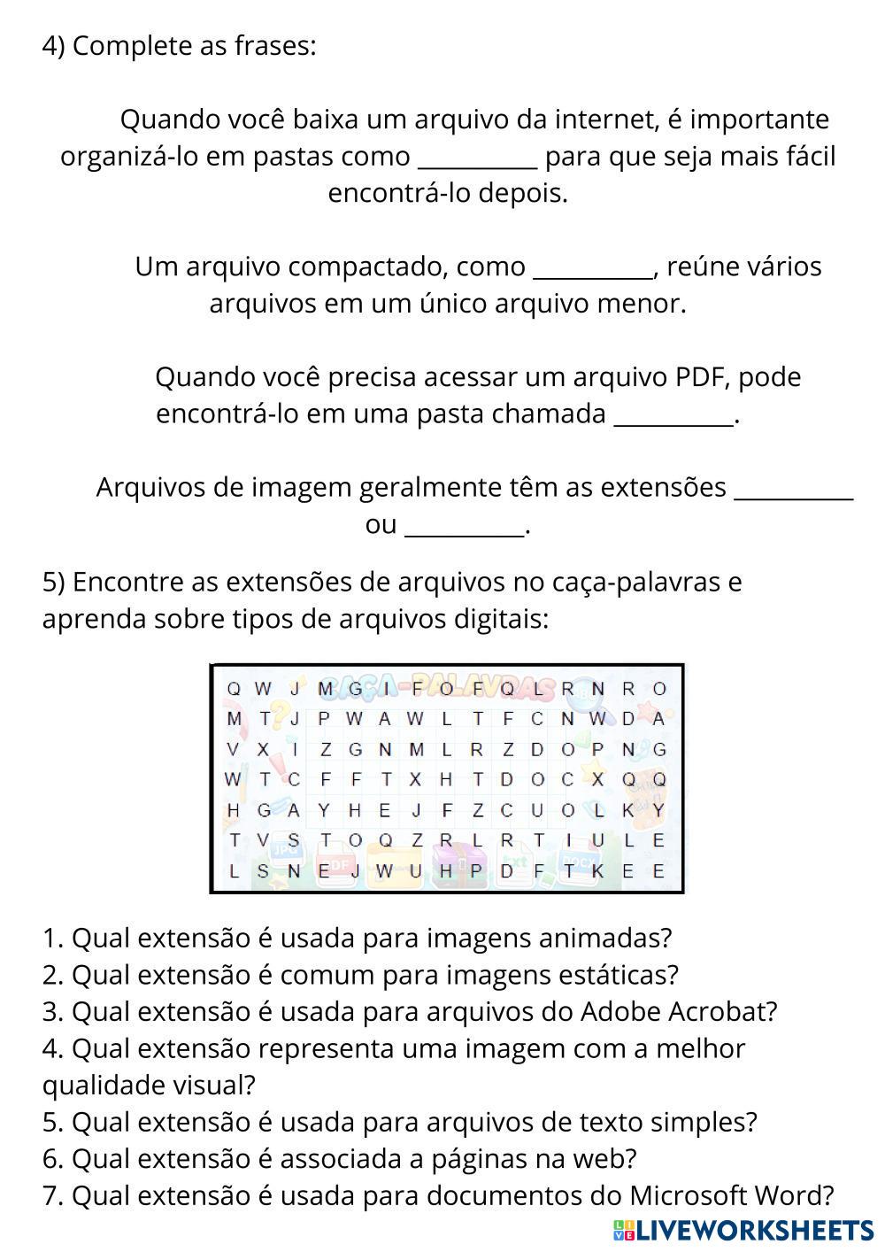 Encontre as extensões no caça‑palavras.