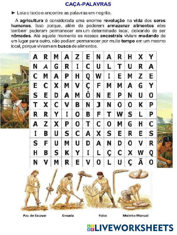 A atividade de caça-palavras a seguir faz parte da unidade de História, mais precisamente na temática de pré-história básica.