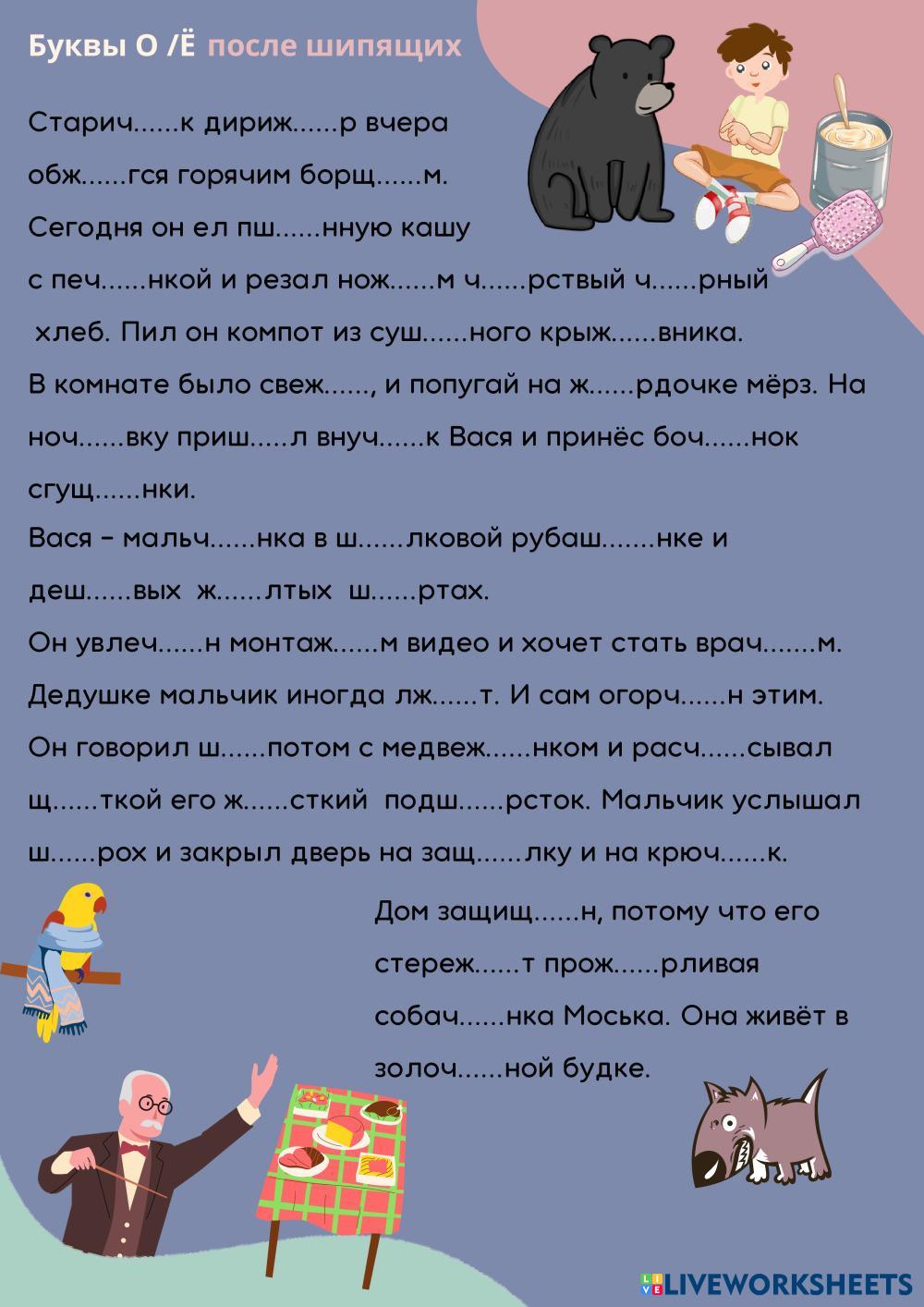 Created by Galina_Kotova ESL B2 Writing Russian Author's Instructions Вставь пропущенные буквы My Google Classroom Courses × 0 classes selected (0 students total) Quick Access Select all classes (0 classes) All Classes Loading courses... Cancel Share Share to selected Course __COURSE_NAME__ __STUDENT_NAME__ (__STUDENT_EMAIL__) О / Ё после шипящих Download Worksheet Validation Check my answers Emails my answers to my teacher Full name Group/level School subject Teacher's email or key code Close Submit Validating worksheet... (12) Your answers have been sent to your teacher. Good luck! OK We encountered an error submitting your answers. Please try again. OK Advertisement | Go Ad Free Created by Galina_Kotova ESL B2 Writing Russian Author's Instructions Вставь пропущенные буквы Explore Worksheets unit 15 class 2 ESL B2 unit 15 class 2 Writing - ESL answer qjerjerjerere Latihan pengukuhan ESL B2 Latihan pengukuhan Writing - ESL Soalan pemahaman: Berdasarkan teks, jawab soalan-soalan berikut. B2 First for Schools paper 1 Writing (2022) ESL B2 B2 First for Schools paper 1 Writing (2022) Writing - ESL Follow the instructions Las cualidades del sonido ESL B2 Las cualidades del sonido Writing - ESL Une las diferentes columnas