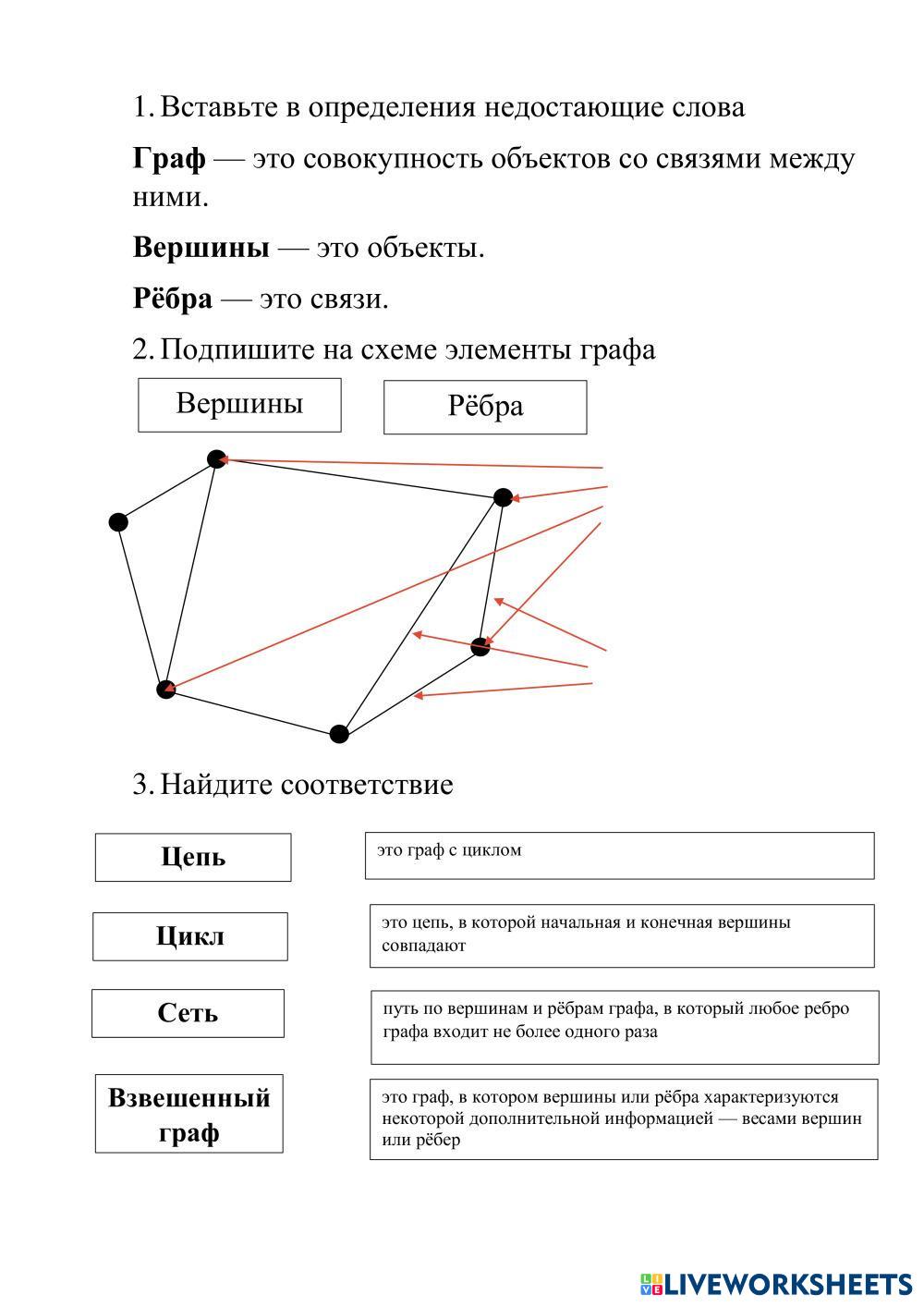 Created byЛюбовь Попова Informatic To consolidate the theoretical materia Age 10+ level: 6 Russian Author's Instructions My Google Classroom Courses × 0 classes selected (0 students total) Quick Access Select all classes (0 classes) All Classes Loading courses... Cancel Share Share to selected Course __COURSE_NAME__ __STUDENT_NAME__ (__STUDENT_EMAIL__) Урок на тему "Графы" Download Worksheet Validation Check my answers Emails my answers to my teacher Full name Group/level School subject Teacher's email or key code Close Submit Validating worksheet... (12) Your answers have been sent to your teacher. Good luck! OK We encountered an error submitting your answers. Please try again. OK Advertisement | Go Ad Free Created byЛюбовь Попова Informatic To consolidate the theoretical materia Age 10+ level: 6 Russian Author's Instructions