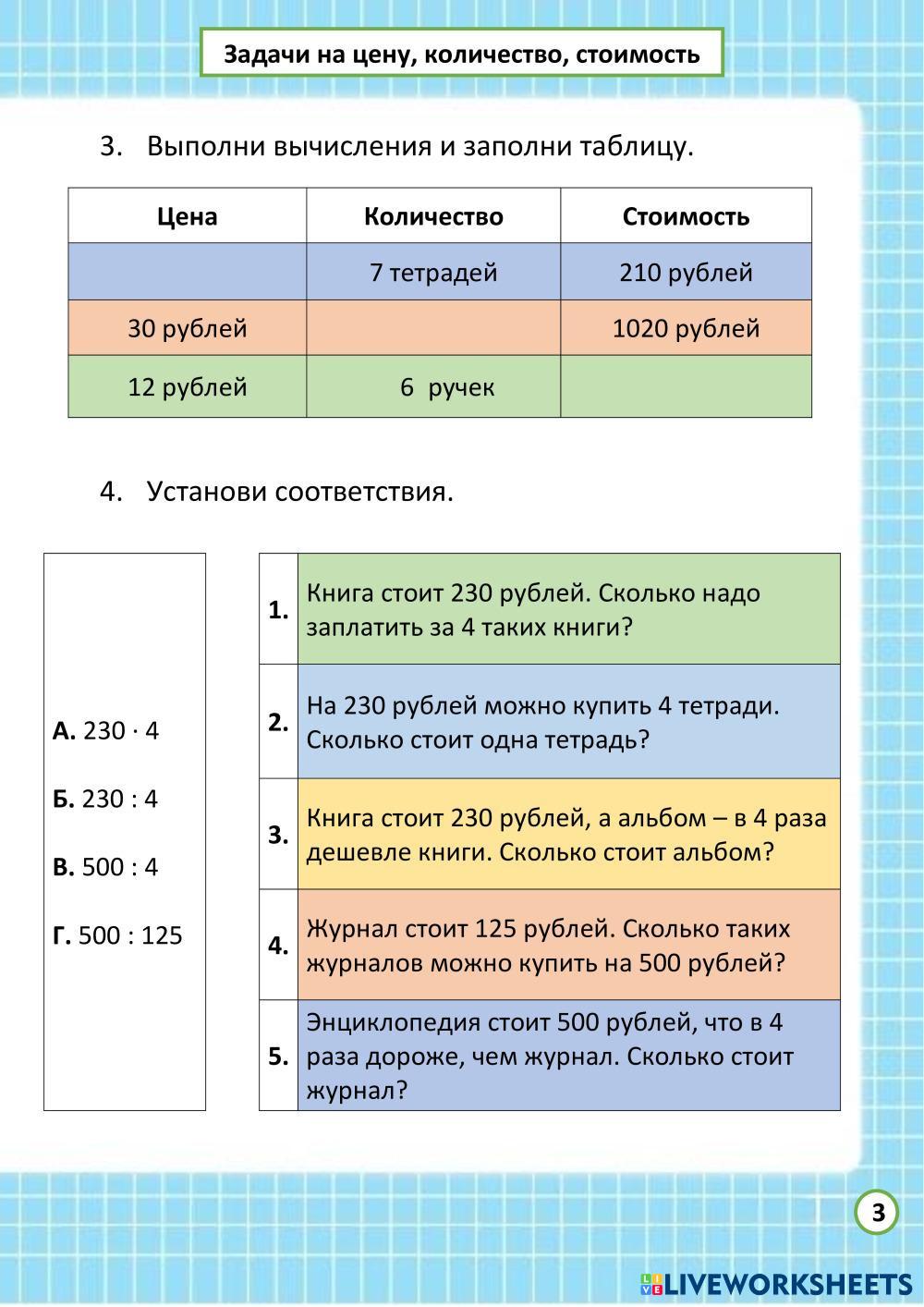 Created by Lazutov_K Maths Exercise Age 7-14 level: 4 класс Russian Author's Instructions My Google Classroom Courses × 0 classes selected (0 students total) Quick Access Select all classes (0 classes) All Classes Loading courses... Cancel Share Share to selected Course __COURSE_NAME__ __STUDENT_NAME__ (__STUDENT_EMAIL__) Математика. Задачи на цену, количество, стоимость. Страница 3 Download Worksheet Validation Check my answers Emails my answers to my teacher Full name Group/level School subject Teacher's email or key code Close Submit Validating worksheet... (12) Your answers have been sent to your teacher. Good luck! OK We encountered an error submitting your answers. Please try again. OK Advertisement | Go Ad Free Created by Lazutov_K Maths Exercise Age 7-14 level: 4 класс Russian Author's Instructions