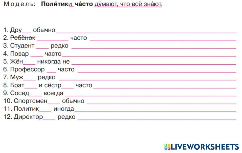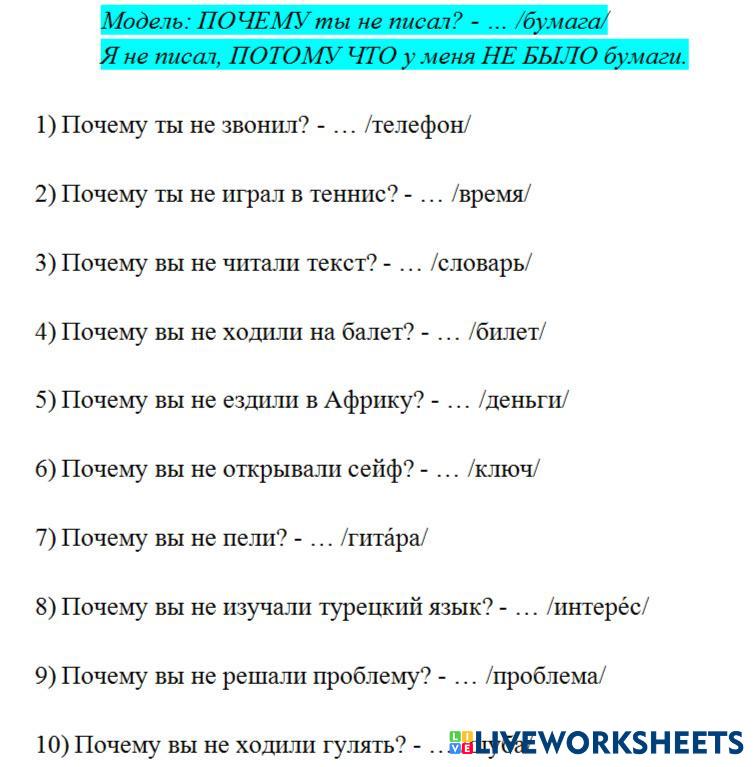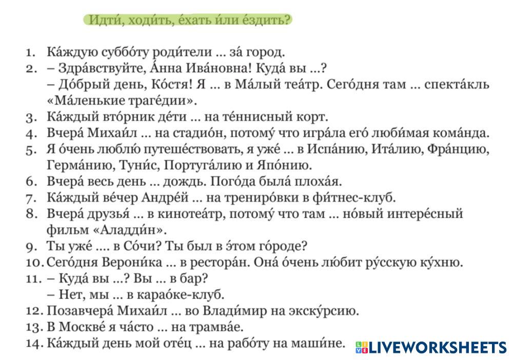 Created byМарина Ивановна Цвинженко Р.п. / ехать, ездить, ходить, идти Р.п. / ехать, ездить, ходить, идти Age 16+ level: А1 Russian Author's Instructions My Google Classroom Courses × 0 classes selected (0 students total) Quick Access Select all classes (0 classes) All Classes Loading courses... Cancel Share Share to selected Course __COURSE_NAME__ __STUDENT_NAME__ (__STUDENT_EMAIL__) Р.п. / ехать, ездить, ходить, идти Download Worksheet Validation Check my answers Emails my answers to my teacher Full name Group/level School subject Teacher's email or key code Close Submit Validating worksheet... (12) Your answers have been sent to your teacher. Good luck! OK We encountered an error submitting your answers. Please try again. OK Advertisement | Go Ad Free Created byМарина Ивановна Цвинженко Р.п. / ехать, ездить, ходить, идти Р.п. / ехать, ездить, ходить, идти Age 16+ level: А1 Russian Author's Instructions
