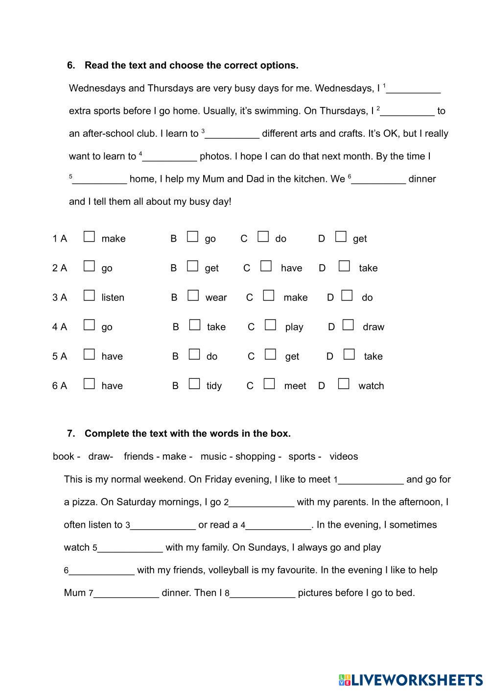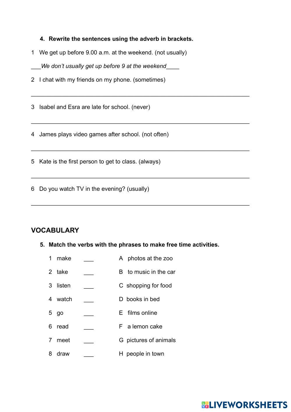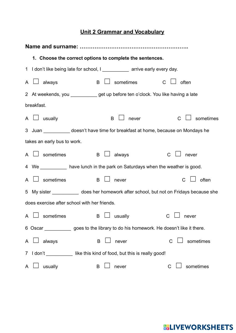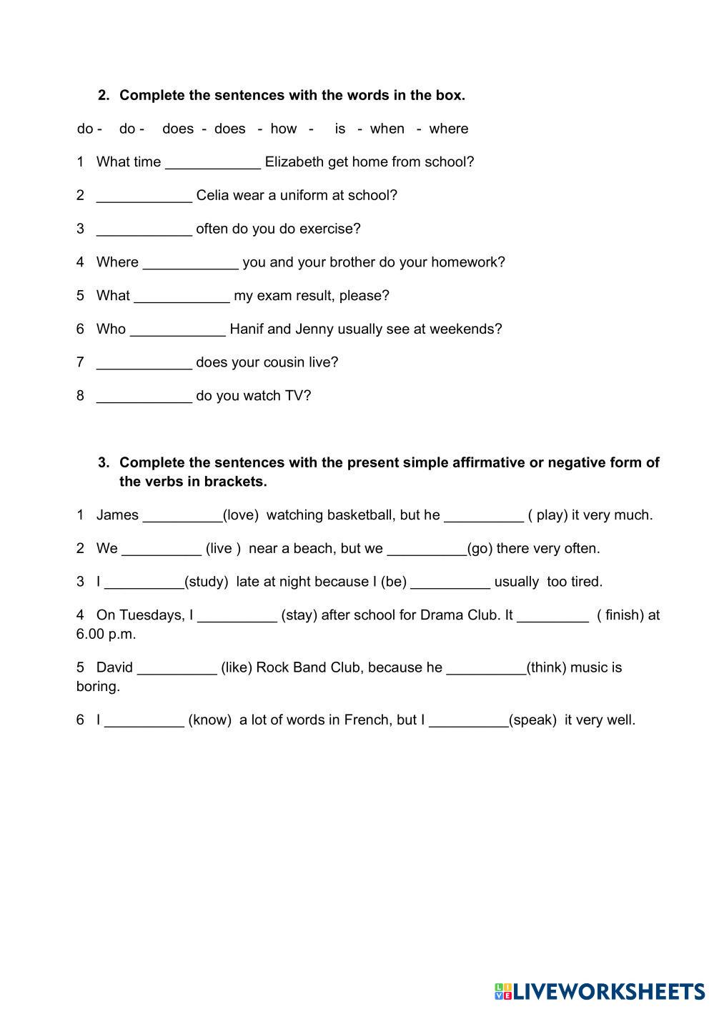 Created byIsabel Benito EFL Present simple Age 11-12 level: 1 ESO Spanish Author's Instructions My Google Classroom Courses × 0 classes selected (0 students total) Quick Access Select all classes (0 classes) All Classes Loading courses... Cancel Share Share to selected Course __COURSE_NAME__ __STUDENT_NAME__ (__STUDENT_EMAIL__) U2 Grammar and vocabulary Download Worksheet Validation Check my answers Emails my answers to my teacher Full name Group/level School subject Teacher's email or key code Close Submit Validating worksheet... (12) Your answers have been sent to your teacher. Good luck! OK We encountered an error submitting your answers. Please try again. OK Advertisement | Go Ad Free Created byIsabel Benito EFL Present simple Age 11-12 level: 1 ESO Spanish Author's Instructions