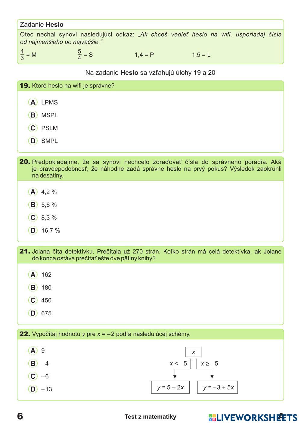 Created by monika_vanyova Matematika testovanie Age 14-18 level: 9 Slovak Author's Instructions My Google Classroom Courses × 0 classes selected (0 students total) Quick Access Select all classes (0 classes) All Classes Loading courses... Cancel Share Share to selected Course __COURSE_NAME__ __STUDENT_NAME__ (__STUDENT_EMAIL__) Testovanie9 2023 Download Worksheet Validation Check my answers Emails my answers to my teacher Full name Group/level School subject Teacher's email or key code Close Submit Validating worksheet... (12) Your answers have been sent to your teacher. Good luck! OK We encountered an error submitting your answers. Please try again. OK Advertisement | Go Ad Free Created by monika_vanyova Matematika testovanie Age 14-18 level: 9 Slovak Author's Instructions