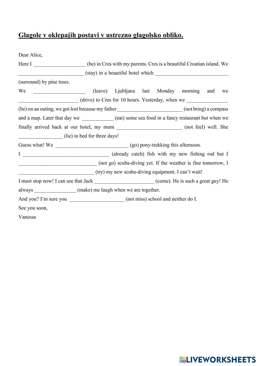 Created by urskad English as a Second Language (ESL) tenses Age 13-17 level: B1 Slovene Author's Instructions My Google Classroom Courses × 0 classes selected (0 students total) Quick Access Select all classes (0 classes) All Classes Loading courses... Cancel Share Share to selected Course __COURSE_NAME__ __STUDENT_NAME__ (__STUDENT_EMAIL__) Preverjanje 9_3 - časi_Cres Download Worksheet Validation Check my answers Emails my answers to my teacher Full name Group/level School subject Teacher's email or key code Close Submit Validating worksheet... (12) Your answers have been sent to your teacher. Good luck! OK We encountered an error submitting your answers. Please try again. OK Advertisement | Go Ad Free Created by urskad English as a Second Language (ESL) tenses Age 13-17 level: B1 Slovene Author's Instructions