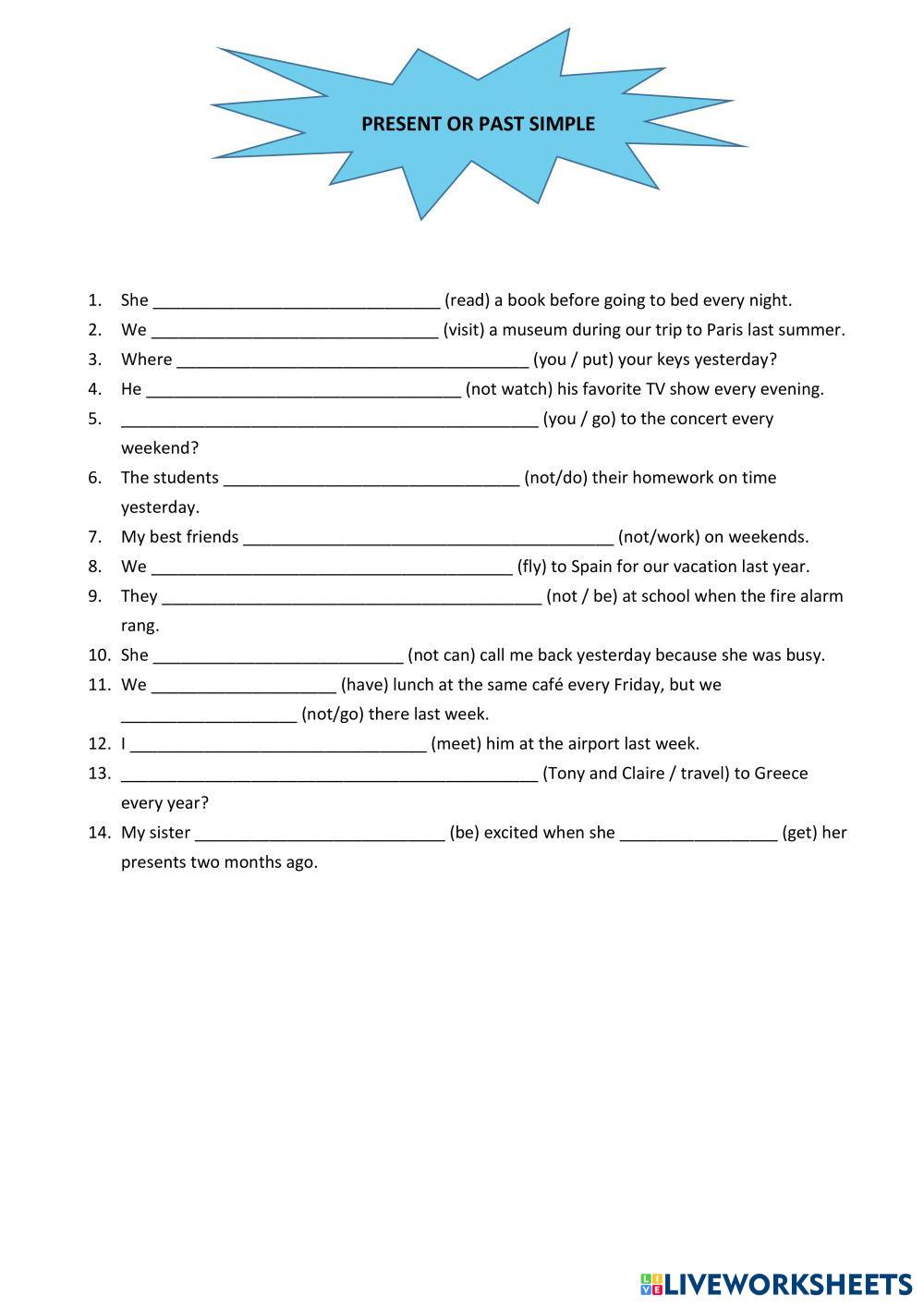 Created by urskad English as a Second Language (ESL) Verb tenses Age 11-16 level: A2 Slovene Author's Instructions My Google Classroom Courses × 0 classes selected (0 students total) Quick Access Select all classes (0 classes) All Classes Loading courses... Cancel Share Share to selected Course __COURSE_NAME__ __STUDENT_NAME__ (__STUDENT_EMAIL__) Present and Past Simple Download Worksheet Validation Check my answers Emails my answers to my teacher Full name Group/level School subject Teacher's email or key code Close Submit Validating worksheet... (12) Your answers have been sent to your teacher. Good luck! OK We encountered an error submitting your answers. Please try again. OK Advertisement | Go Ad Free Created by urskad English as a Second Language (ESL) Verb tenses Age 11-16 level: A2 Slovene Author's Instructions