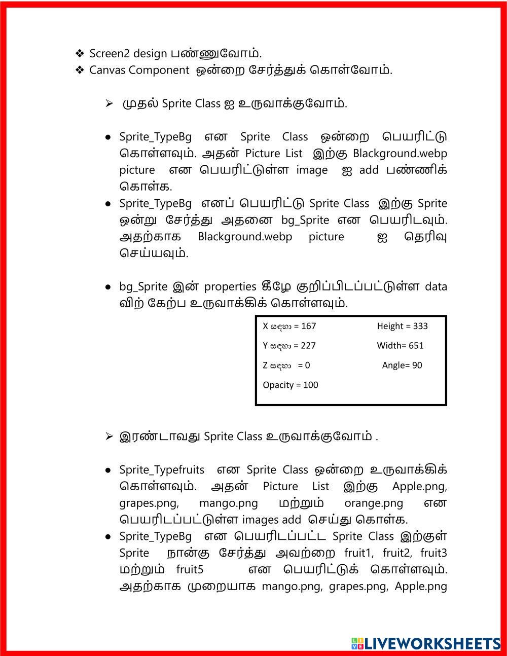 Created byH.M. Wijewardana COMPUTER SCIENCE Thunkable Age 5+ level: 7 Tamil Author's Instructions My Google Classroom Courses × 0 classes selected (0 students total) Quick Access Select all classes (0 classes) All Classes Loading courses... Cancel Share Share to selected Course __COURSE_NAME__ __STUDENT_NAME__ (__STUDENT_EMAIL__) Tamil assignment for project 108 Download Worksheet Validation Check my answers Emails my answers to my teacher Full name Group/level School subject Teacher's email or key code Close Submit Validating worksheet... (12) Your answers have been sent to your teacher. Good luck! OK We encountered an error submitting your answers. Please try again. OK Advertisement | Go Ad Free Created byH.M. Wijewardana COMPUTER SCIENCE Thunkable Age 5+ level: 7 Tamil Author's Instructions