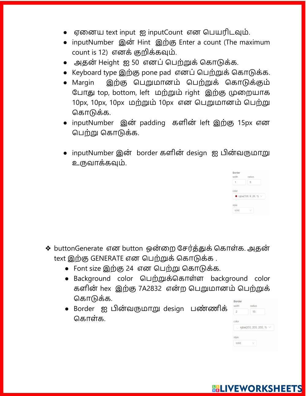 Created byH.M. Wijewardana COMPUTER SCIENCE Thunkable Age 5+ level: 7 Tamil Author's Instructions My Google Classroom Courses × 0 classes selected (0 students total) Quick Access Select all classes (0 classes) All Classes Loading courses... Cancel Share Share to selected Course __COURSE_NAME__ __STUDENT_NAME__ (__STUDENT_EMAIL__) Tamil assignment for project 110 Download Worksheet Validation Check my answers Emails my answers to my teacher Full name Group/level School subject Teacher's email or key code Close Submit Validating worksheet... (12) Your answers have been sent to your teacher. Good luck! OK We encountered an error submitting your answers. Please try again. OK Advertisement | Go Ad Free Created byH.M. Wijewardana COMPUTER SCIENCE Thunkable Age 5+ level: 7 Tamil Author's Instructions