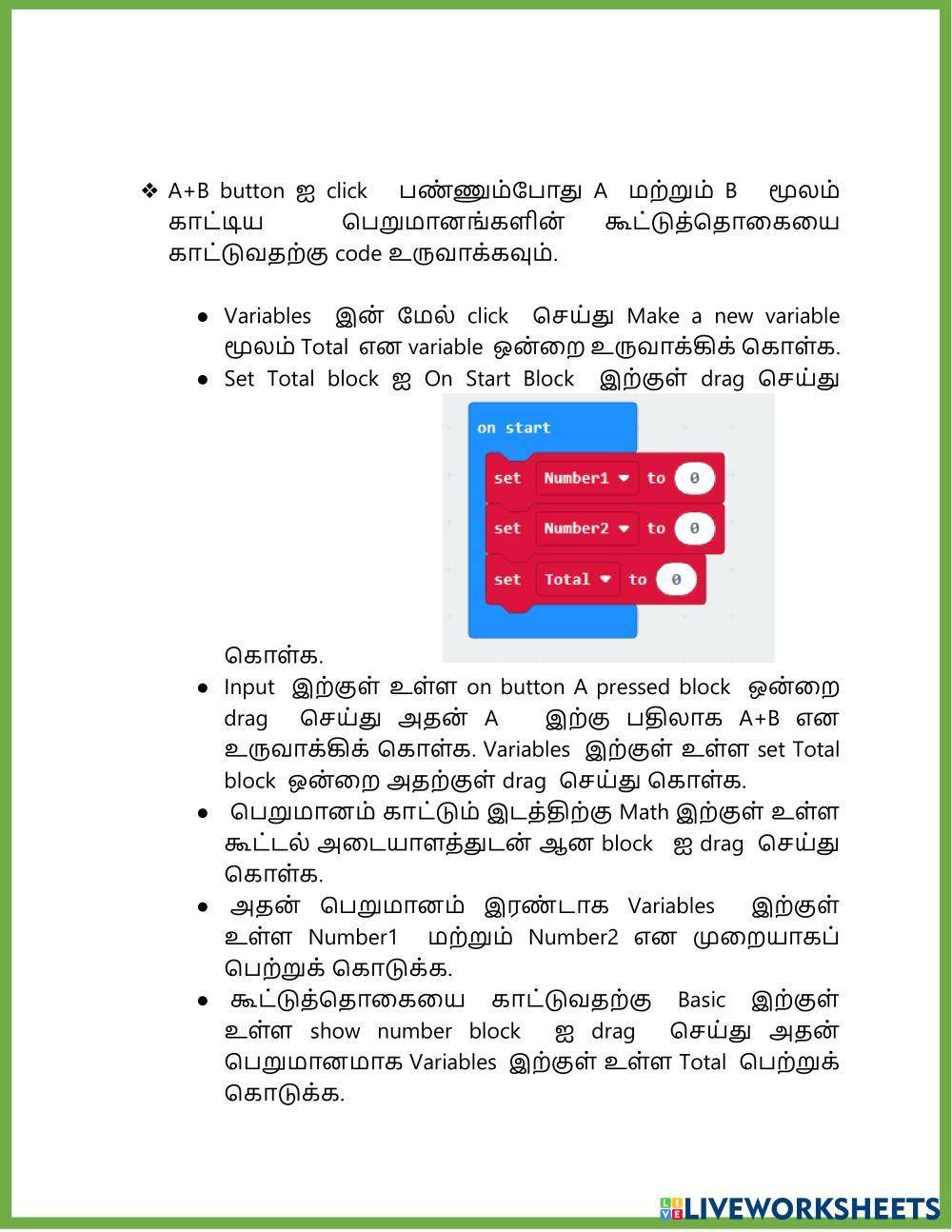 Created byH.M. Wijewardana COMPUTER SCIENCE Micro:bit Age 5+ level: 7 Tamil Author's Instructions My Google Classroom Courses × 0 classes selected (0 students total) Quick Access Select all classes (0 classes) All Classes Loading courses... Cancel Share Share to selected Course __COURSE_NAME__ __STUDENT_NAME__ (__STUDENT_EMAIL__) Tamil assignment for project 128 Download Worksheet Validation Check my answers Emails my answers to my teacher Full name Group/level School subject Teacher's email or key code Close Submit Validating worksheet... (12) Your answers have been sent to your teacher. Good luck! OK We encountered an error submitting your answers. Please try again. OK Advertisement | Go Ad Free Created byH.M. Wijewardana COMPUTER SCIENCE Micro:bit Age 5+ level: 7 Tamil Author's Instructions