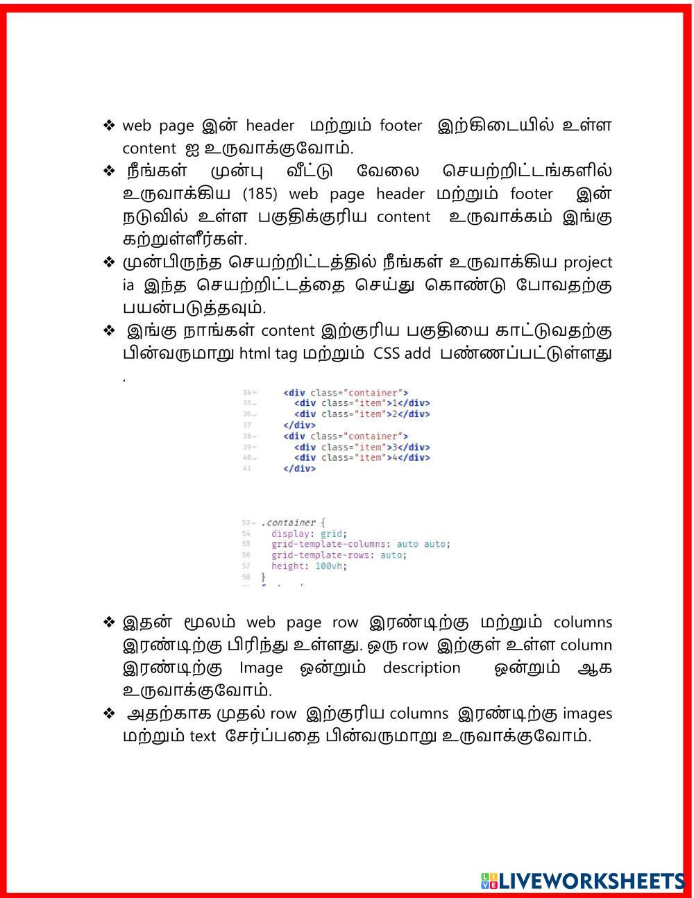 Created byH.M. Wijewardana COMPUTER SCIENCE HTML Age 5+ level: 7 Tamil Author's Instructions My Google Classroom Courses × 0 classes selected (0 students total) Quick Access Select all classes (0 classes) All Classes Loading courses... Cancel Share Share to selected Course __COURSE_NAME__ __STUDENT_NAME__ (__STUDENT_EMAIL__) Tamil assignments for project 186 Download Worksheet Validation Check my answers Emails my answers to my teacher Full name Group/level School subject Teacher's email or key code Close Submit Validating worksheet... (12) Your answers have been sent to your teacher. Good luck! OK We encountered an error submitting your answers. Please try again. OK Advertisement | Go Ad Free Created byH.M. Wijewardana COMPUTER SCIENCE HTML Age 5+ level: 7 Tamil Author's Instructions