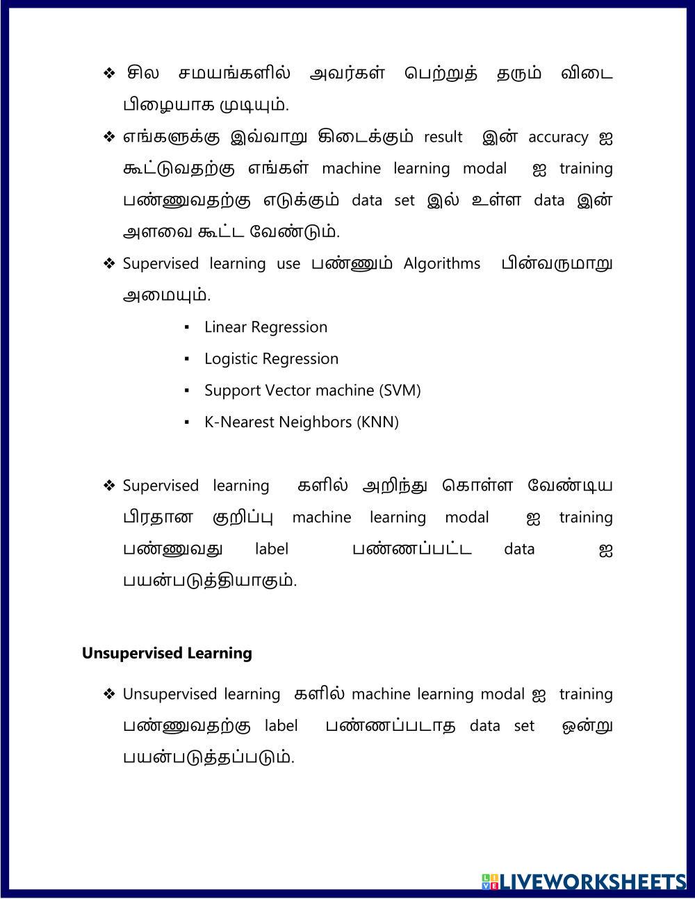 Created byH.M. Wijewardana COMPUTER SCIENCE AI Age 5+ level: 7 Tamil Author's Instructions My Google Classroom Courses × 0 classes selected (0 students total) Quick Access Select all classes (0 classes) All Classes Loading courses... Cancel Share Share to selected Course __COURSE_NAME__ __STUDENT_NAME__ (__STUDENT_EMAIL__) Tamil assignments for project 158 Download Worksheet Validation Check my answers Emails my answers to my teacher Full name Group/level School subject Teacher's email or key code Close Submit Validating worksheet... (12) Your answers have been sent to your teacher. Good luck! OK We encountered an error submitting your answers. Please try again. OK Advertisement | Go Ad Free Created byH.M. Wijewardana COMPUTER SCIENCE AI Age 5+ level: 7 Tamil Author's Instructions