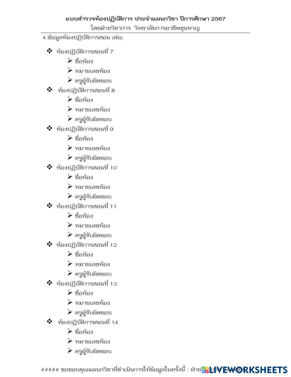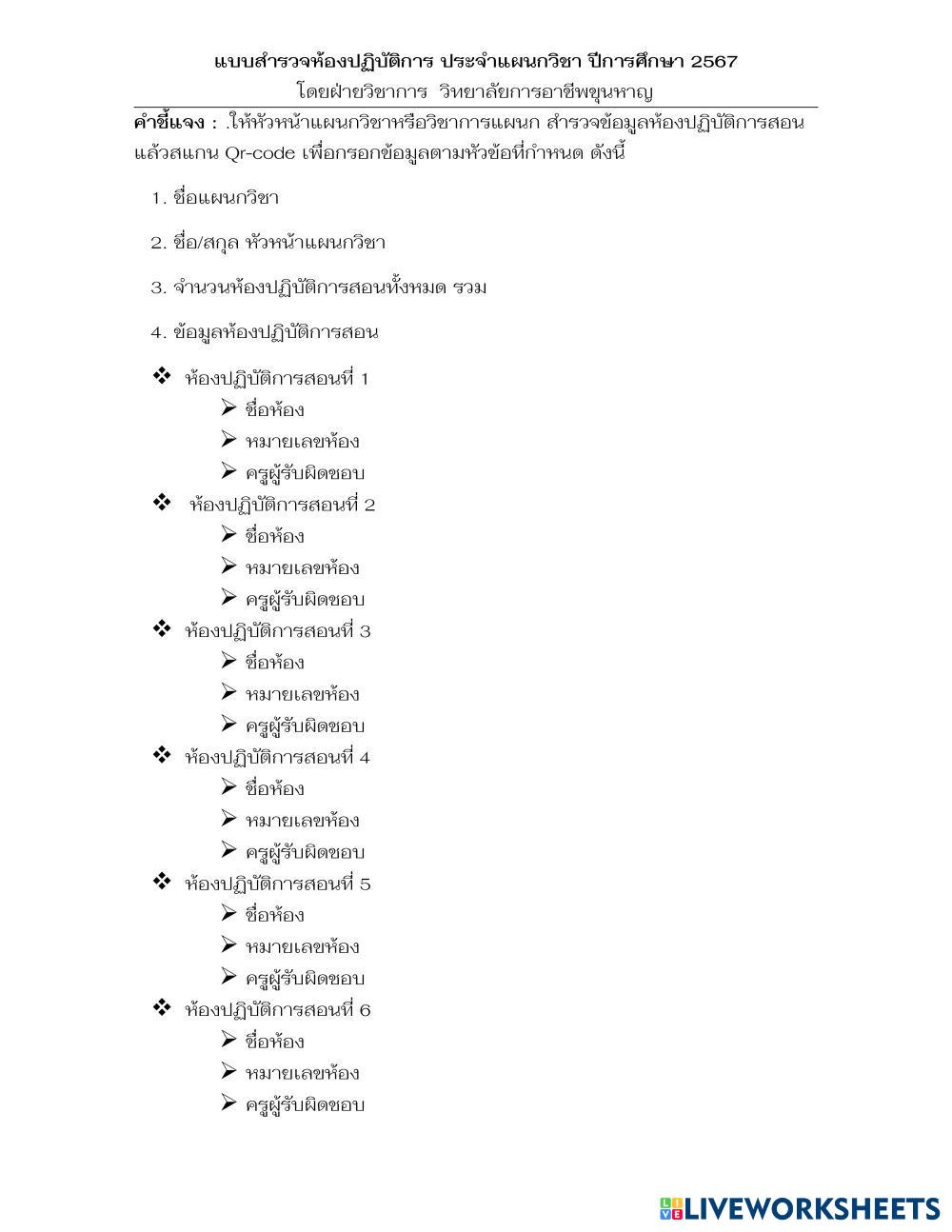 Created by arunchumard แบบสำรวจข้อมูล แบบสำรวจข้อมูลห้องปฏิบัติการสอน Age 18+ level: ครูผู้สอน Thai Author's Instructions - My Google Classroom Courses × 0 classes selected (0 students total) Quick Access Select all classes (0 classes) All Classes Loading courses... Cancel Share Share to selected Course __COURSE_NAME__ __STUDENT_NAME__ (__STUDENT_EMAIL__) แบบสำรวจข้อมูลห้องปฏิบัติการสอน วิทยาลัยการอาชีพขุนหาญ Download Worksheet Validation Check my answers Emails my answers to my teacher Full name Group/level School subject Teacher's email or key code Close Submit Validating worksheet... (12) Your answers have been sent to your teacher. Good luck! OK We encountered an error submitting your answers. Please try again. OK Advertisement | Go Ad Free Created by arunchumard แบบสำรวจข้อมูล แบบสำรวจข้อมูลห้องปฏิบัติการสอน Age 18+ level: ครูผู้สอน Thai Author's Instructions -