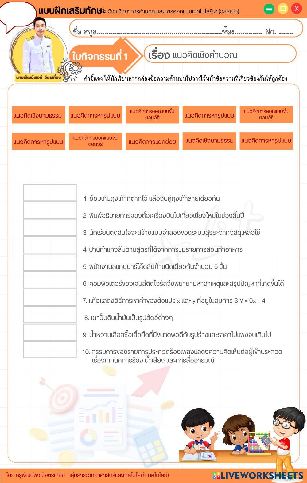 Created by patpong094 แนวคิดเชิงคำนวณ computter Age 13-17 level: ม.2 Thai Author's Instructions My Google Classroom Courses × 0 classes selected (0 students total) Quick Access Select all classes (0 classes) All Classes Loading courses... Cancel Share Share to selected Course __COURSE_NAME__ __STUDENT_NAME__ (__STUDENT_EMAIL__) ใบงานที่ 1 เรื่อง แนวคิดเชิงคำนวณ Download Worksheet Validation Check my answers Emails my answers to my teacher Full name Group/level School subject Teacher's email or key code Close Submit Validating worksheet... (12) Your answers have been sent to your teacher. Good luck! OK We encountered an error submitting your answers. Please try again. OK Advertisement | Go Ad Free Created by patpong094 แนวคิดเชิงคำนวณ computter Age 13-17 level: ม.2 Thai Author's Instructions