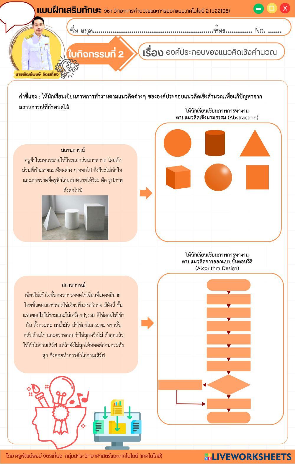 Created by patpong094 Computer Science Computer Age 13-17 level: ม.2 Thai Author's Instructions My Google Classroom Courses × 0 classes selected (0 students total) Quick Access Select all classes (0 classes) All Classes Loading courses... Cancel Share Share to selected Course __COURSE_NAME__ __STUDENT_NAME__ (__STUDENT_EMAIL__) ใบงานที่ 2 เรื่อง องค์ประกอบของแนวคิดเชิงคำนวณ Download Worksheet Validation Check my answers Emails my answers to my teacher Full name Group/level School subject Teacher's email or key code Close Submit Validating worksheet... (12) Your answers have been sent to your teacher. Good luck! OK We encountered an error submitting your answers. Please try again. OK Advertisement | Go Ad Free Created by patpong094 Computer Science Computer Age 13-17 level: ม.2 Thai Author's Instructions