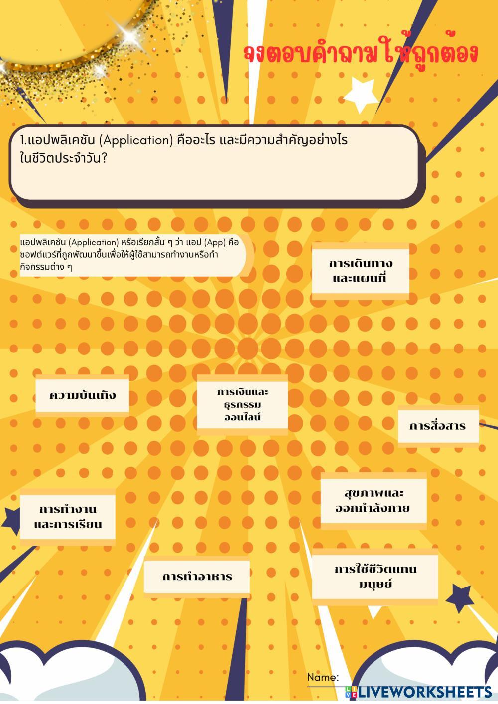 Created bySatetharat Buajeen Computer Science Application Development Age 15+ level: Grade 9 Thai Author's Instructions My Google Classroom Courses × 0 classes selected (0 students total) Quick Access Select all classes (0 classes) All Classes Loading courses... Cancel Share Share to selected Course __COURSE_NAME__ __STUDENT_NAME__ (__STUDENT_EMAIL__) Pooh Download Worksheet Validation Check my answers Emails my answers to my teacher Full name Group/level School subject Teacher's email or key code Close Submit Validating worksheet... (12) Your answers have been sent to your teacher. Good luck! OK We encountered an error submitting your answers. Please try again. OK Advertisement | Go Ad Free Created bySatetharat Buajeen Computer Science Application Development Age 15+ level: Grade 9 Thai Author's Instructions