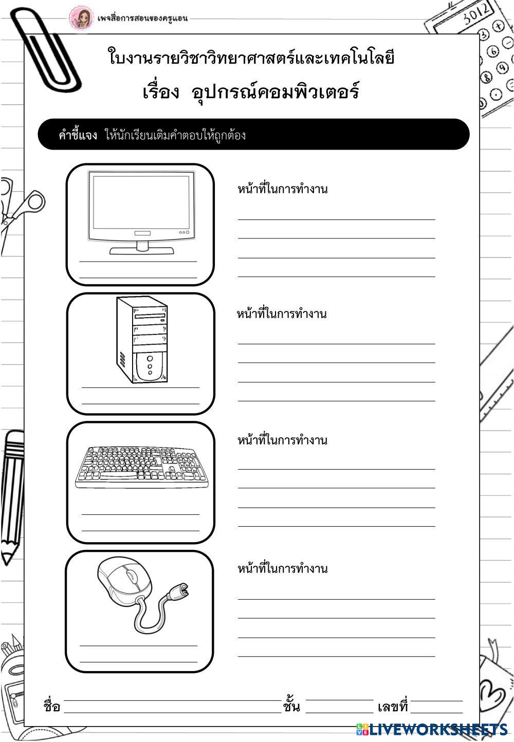 Created bysiwat dangleeta Computer - Age 13-18 level: 7-9 Thai Author's Instructions My Google Classroom Courses × 0 classes selected (0 students total) Quick Access Select all classes (0 classes) All Classes Loading courses... Cancel Share Share to selected Course __COURSE_NAME__ __STUDENT_NAME__ (__STUDENT_EMAIL__) อุปกรณ์คอมพิวเตอร์ Download Worksheet Validation Check my answers Emails my answers to my teacher Full name Group/level School subject Teacher's email or key code Close Submit Validating worksheet... (12) Your answers have been sent to your teacher. Good luck! OK We encountered an error submitting your answers. Please try again. OK Advertisement | Go Ad Free Created bysiwat dangleeta Computer - Age 13-18 level: 7-9 Thai Author's Instructions