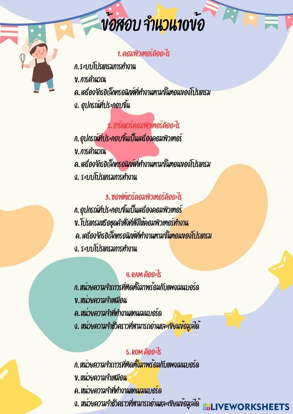 Created byParichartChansorn computer Computer Age 18+ level: 1 Thai Author's Instructions My Google Classroom Courses × 0 classes selected (0 students total) Quick Access Select all classes (0 classes) All Classes Loading courses... Cancel Share Share to selected Course __COURSE_NAME__ __STUDENT_NAME__ (__STUDENT_EMAIL__) ParichartChansorn Download Worksheet Validation Check my answers Emails my answers to my teacher Full name Group/level School subject Teacher's email or key code Close Submit Validating worksheet... (12) Your answers have been sent to your teacher. Good luck! OK We encountered an error submitting your answers. Please try again. OK Advertisement | Go Ad Free Created byParichartChansorn computer Computer Age 18+ level: 1 Thai Author's Instructions
