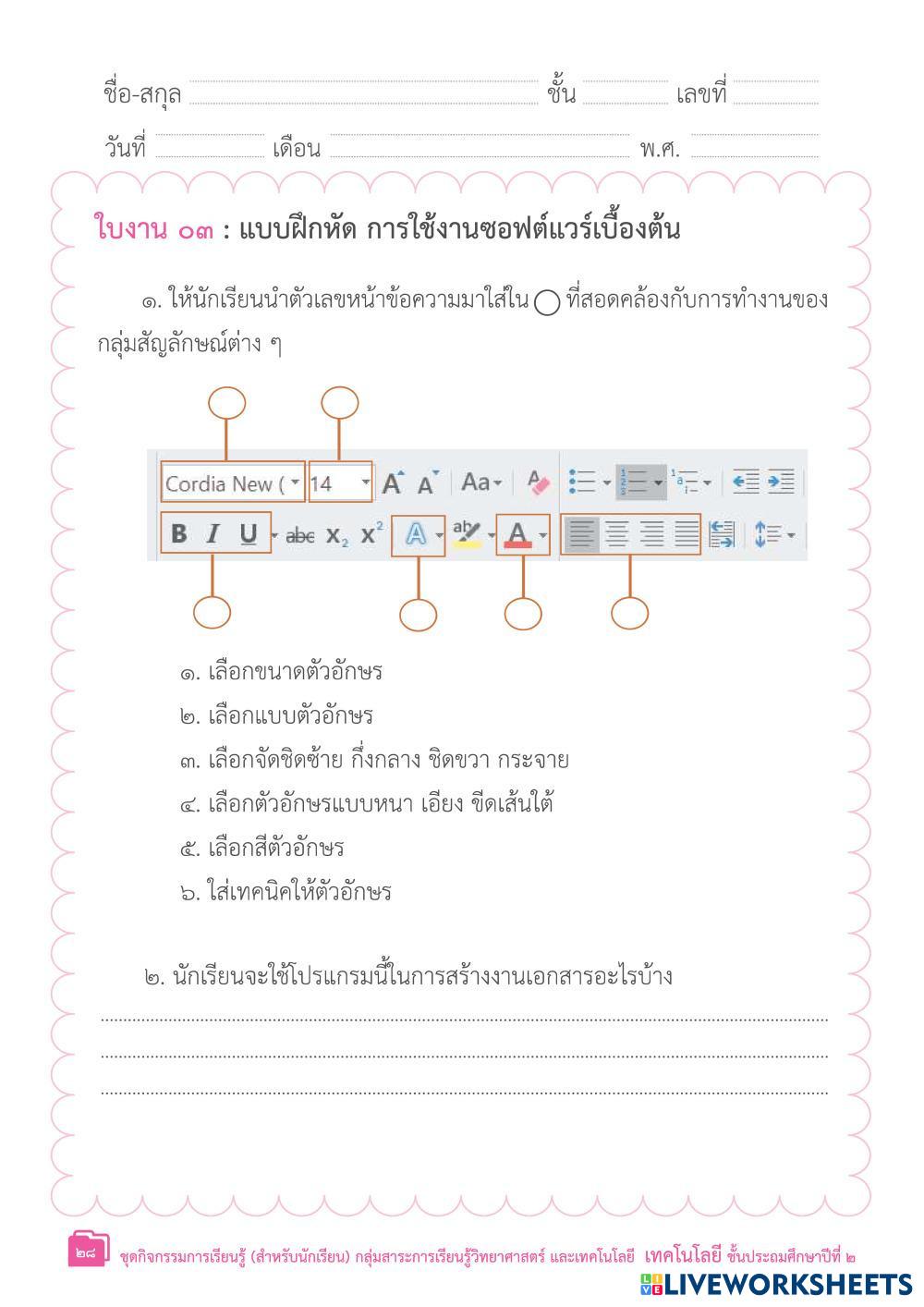 Created byPanut Suwitayasak Computer computer Age 7-11 level: grade 4 Thai Author's Instructions My Google Classroom Courses × 0 classes selected (0 students total) Quick Access Select all classes (0 classes) All Classes Loading courses... Cancel Share Share to selected Course __COURSE_NAME__ __STUDENT_NAME__ (__STUDENT_EMAIL__) ใบงานที่ 3 การใช้ซอฟท์แวร์เบื้องต้น Download Worksheet Validation Check my answers Emails my answers to my teacher Full name Group/level School subject Teacher's email or key code Close Submit Validating worksheet... (12) Your answers have been sent to your teacher. Good luck! OK We encountered an error submitting your answers. Please try again. OK Advertisement | Go Ad Free Created byPanut Suwitayasak Computer computer Age 7-11 level: grade 4 Thai Author's Instructions
