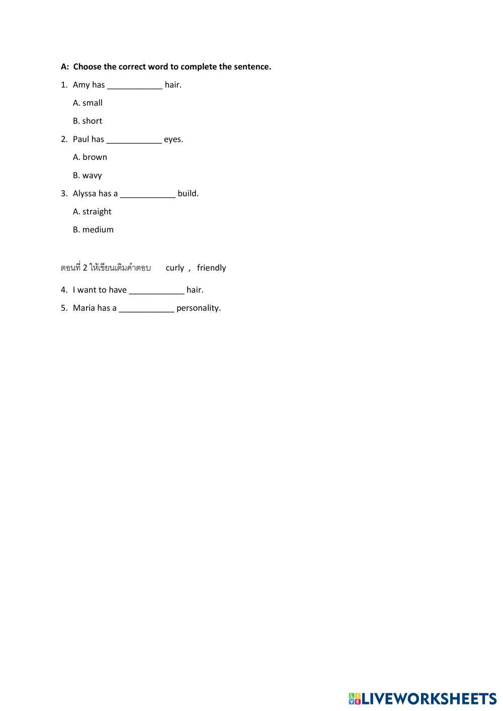 Created byWichan Phromsorn Enhlish Describe Age 10-18 level: 2 Thai Author's Instructions - My Google Classroom Courses × 0 classes selected (0 students total) Quick Access Select all classes (0 classes) All Classes Loading courses... Cancel Share Share to selected Course __COURSE_NAME__ __STUDENT_NAME__ (__STUDENT_EMAIL__) Eng22101 Download Worksheet Validation Check my answers Emails my answers to my teacher Full name Group/level School subject Teacher's email or key code Close Submit Validating worksheet... (12) Your answers have been sent to your teacher. Good luck! OK We encountered an error submitting your answers. Please try again. OK Advertisement | Go Ad Free Created byWichan Phromsorn Enhlish Describe Age 10-18 level: 2 Thai Author's Instructions -