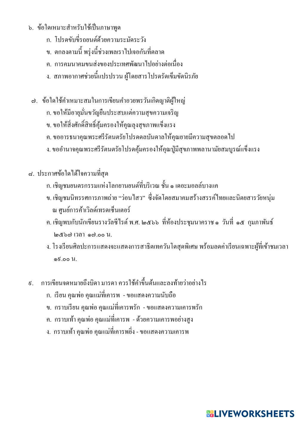 Created byPattaravich Khansumlee ESL Thai B1-Intermediate Grammar Thai Author's Instructions G.6 My Google Classroom Courses × 0 classes selected (0 students total) Quick Access Select all classes (0 classes) All Classes Loading courses... Cancel Share Share to selected Course __COURSE_NAME__ __STUDENT_NAME__ (__STUDENT_EMAIL__) ข้อสอบปลายภาค 1 G.6 Download Worksheet Validation Check my answers Emails my answers to my teacher Full name Group/level School subject Teacher's email or key code Close Submit Validating worksheet... (12) Your answers have been sent to your teacher. Good luck! OK We encountered an error submitting your answers. Please try again. OK Advertisement | Go Ad Free Created byPattaravich Khansumlee ESL Thai B1-Intermediate Grammar Thai Author's Instructions G.6 Explore Worksheets If clause type 2 ESL B1-Intermediate If clause type 2 Grammar - ESL if clause type2 ประโยคซ้อน ESL B1-Intermediate ประโยคซ้อน Grammar - ESL ให้นักเรียนวิเคราะห์ประโยคซ้อนในประเด็นที่กำหนดให้ของแต่ละข้อ ประโยคซ้อน ESL B1-Intermediate ประโยคซ้อน Grammar - ESL ให้นักเรียนวิเคราะห์ประโยคซ้อนตามประเด็นที่กำหนดให้ในแต่ละข้อ กิจกรรมขั้นที่ ๕ เรียงประโยคง่ายนิดเดียว ESL B1-Intermediate กิจกรรมขั้นที่ ๕ เรียงประโยคง่ายนิดเดียว Grammar - ESL เรียงคำให้เป็นประโยคที่สมบูรณ์