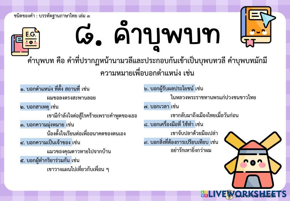 Created by 14674 ESL Thai B2 Grammar Thai Author's Instructions เติมคำให้ถูกกต้องตามชนิดของคำทั้ง 12 ชนิด My Google Classroom Courses × 0 classes selected (0 students total) Quick Access Select all classes (0 classes) All Classes Loading courses... Cancel Share Share to selected Course __COURSE_NAME__ __STUDENT_NAME__ (__STUDENT_EMAIL__) แบบฝึก ชนิดของคำในภาษาไทย Download Worksheet Validation Check my answers Emails my answers to my teacher Full name Group/level School subject Teacher's email or key code Close Submit Validating worksheet... (12) Your answers have been sent to your teacher. Good luck! OK We encountered an error submitting your answers. Please try again. OK Advertisement | Go Ad Free Created by 14674 ESL Thai B2 Grammar Thai Author's Instructions เติมคำให้ถูกกต้องตามชนิดของคำทั้ง 12 ชนิด Explore Worksheets ใบงานการแสดงนาฏศิลป์ไทย ม.2 ESL B2 ใบงานการแสดงนาฏศิลป์ไทย ม.2 Grammar - ESL เติมคำ เพลงรำวงมาตรฐาน (เพลงคืนเดือนหงาย) ข้อสอบสำนวนไทย ESL B2 ข้อสอบสำนวนไทย Grammar - ESL ให้นักเรียนเลือกสำนวนไทยให้สัมพันธ์กับความหมาย ข้อสอบสำนวนไทย ESL B2 ข้อสอบสำนวนไทย Grammar - ESL ให้นักเรียนจับคู่สำนวนไทยกับความหมายให้ถูกต้อง ใบงานเรื่องคำสมาส ESL B2 ใบงานเรื่องคำสมาส Grammar - ESL ชั้นม.6
