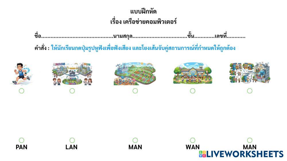 Created by Wacharaphon ESL Thai A2 Listening Thai Author's Instructions ให้ฟังเสียงแล้วโยงเส้นจับคู่จับคู่จากสถาการณ์ที่กดหนดว่าเป็นเครือข่ายคอมพิวเตอร์ประเภทใด My Google Classroom Courses × 0 classes selected (0 students total) Quick Access Select all classes (0 classes) All Classes Loading courses... Cancel Share Share to selected Course __COURSE_NAME__ __STUDENT_NAME__ (__STUDENT_EMAIL__) โยงเส้นจับคู่ Download Worksheet Validation Check my answers Emails my answers to my teacher Full name Group/level School subject Teacher's email or key code Close Submit Validating worksheet... (12) Your answers have been sent to your teacher. Good luck! OK We encountered an error submitting your answers. Please try again. OK Advertisement | Go Ad Free Created by Wacharaphon ESL Thai A2 Listening Thai Author's Instructions ให้ฟังเสียงแล้วโยงเส้นจับคู่จับคู่จากสถาการณ์ที่กดหนดว่าเป็นเครือข่ายคอมพิวเตอร์ประเภทใด Explore Worksheets โยงเส้นจับคู่ ESL A2 โยงเส้นจับคู่ Listening - ESL ให้กดฟังเสียงสถาานการณ์แล้วโยงเส้นไปที่ประเภทของเครือข่ายคอมพิวเตอร์ Avenger Sign_Listen and Select ESL A2 Avenger Sign_Listen and Select Listening - ESL ป.1 Listening_THAI ESL A2 Listening_THAI Listening - ESL Thai 6711213 รามเกียรติ์_singlechoice ESL A2 รามเกียรติ์_singlechoice Listening - ESL ป.5