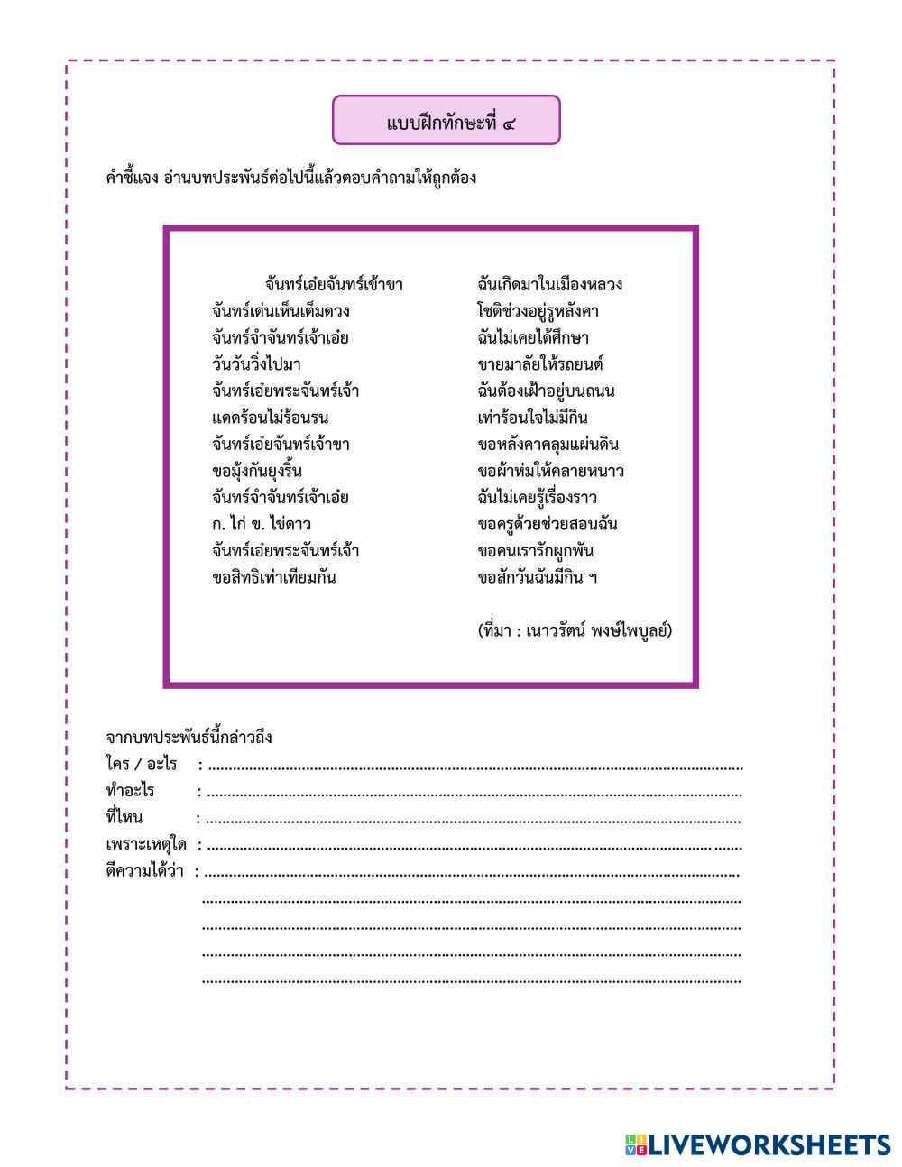 Created bysaowaluk s0nnuwat ESL Thai B2 Reading Thai Author's Instructions อ่านบทประพันธ์ต่อไปนี้แล้วตอบคําถามให้ถูกต้อง My Google Classroom Courses × 0 classes selected (0 students total) Quick Access Select all classes (0 classes) All Classes Loading courses... Cancel Share Share to selected Course __COURSE_NAME__ __STUDENT_NAME__ (__STUDENT_EMAIL__) การอ่านตีความแบบฝึกที่4 Download Worksheet Validation Check my answers Emails my answers to my teacher Full name Group/level School subject Teacher's email or key code Close Submit Validating worksheet... (12) Your answers have been sent to your teacher. Good luck! OK We encountered an error submitting your answers. Please try again. OK Advertisement | Go Ad Free Created bysaowaluk s0nnuwat ESL Thai B2 Reading Thai Author's Instructions อ่านบทประพันธ์ต่อไปนี้แล้วตอบคําถามให้ถูกต้อง Explore Worksheets การอ่านตีความแบบฝึกที่3 ESL B2 การอ่านตีความแบบฝึกที่3 Reading - ESL ให้นักเรียนตอบคำถามให้ถูกต้อง การอ่านตีความแบบฝึกที่2 ESL B2 การอ่านตีความแบบฝึกที่2 Reading - ESL เลือกคำตอบที่ถูกต้อง การอ่านตีความแบบฝึกที่1 ESL B2 การอ่านตีความแบบฝึกที่1 Reading - ESL เลือกคำตอบที่ถูกต้อง การอ่านตีความ ESL B2 การอ่านตีความ Reading - ESL เติมคำตอบลงในช่องว่าง
