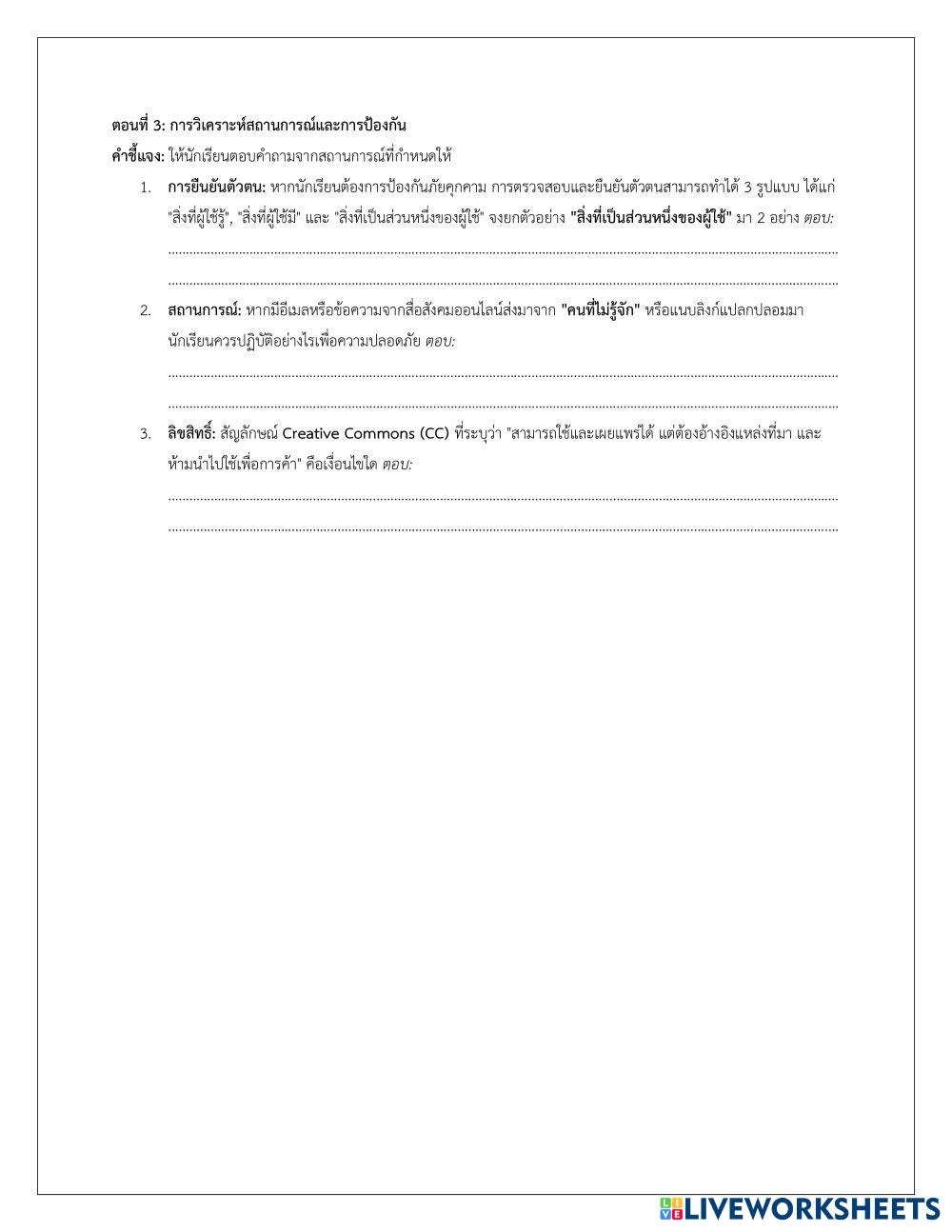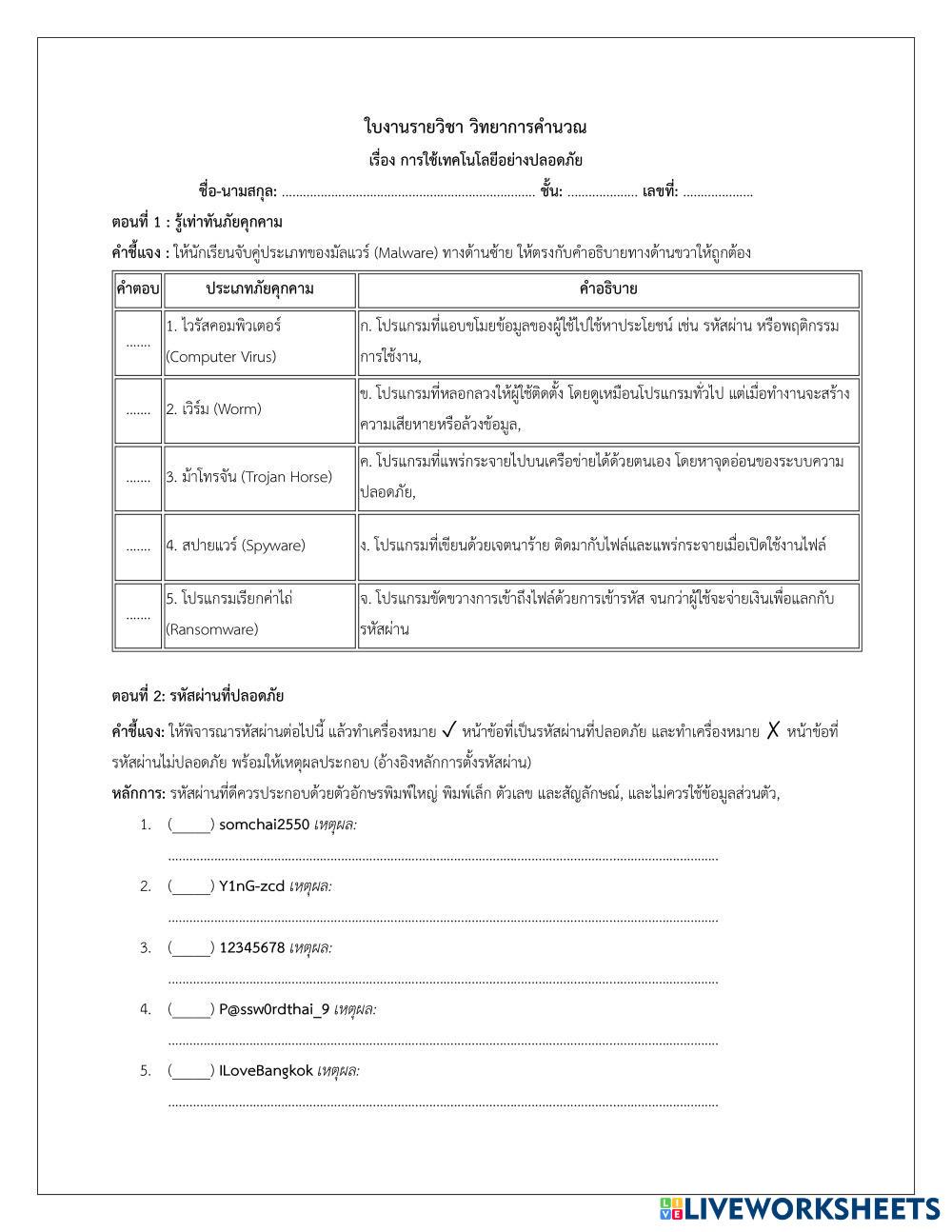 Created by KruKhuen ESL Thai A1 Vocabulary Thai Author's Instructions ใบงาน ม.1 My Google Classroom Courses × 0 classes selected (0 students total) Quick Access Select all classes (0 classes) All Classes Loading courses... Cancel Share Share to selected Course __COURSE_NAME__ __STUDENT_NAME__ (__STUDENT_EMAIL__) การใช้เทคโนโลยีอย่าปลอดภัย ม.1 Download Worksheet Validation Check my answers Emails my answers to my teacher Full name Group/level School subject Teacher's email or key code Close Submit Validating worksheet... (12) Your answers have been sent to your teacher. Good luck! OK We encountered an error submitting your answers. Please try again. OK Advertisement | Go Ad Free Created by KruKhuen ESL Thai A1 Vocabulary Thai Author's Instructions ใบงาน ม.1 Explore Worksheets โยงเส้นคำศัพท์ ESL A1 โยงเส้นคำศัพท์ Vocabulary - ESL โยงเส้นคำศัพท์ คำความหมายกับรูปภาพ ESL A1 คำความหมายกับรูปภาพ Vocabulary - ESL คำความหมายกับรูปภาพ คำศัพท์อย่างง่าย ESL A1 คำศัพท์อย่างง่าย Vocabulary - ESL คำศัพท์อย่างง่าย จับคู่คำศัพท์ ESL A1 จับคู่คำศัพท์ Vocabulary - ESL จับคู่คำศัพท์