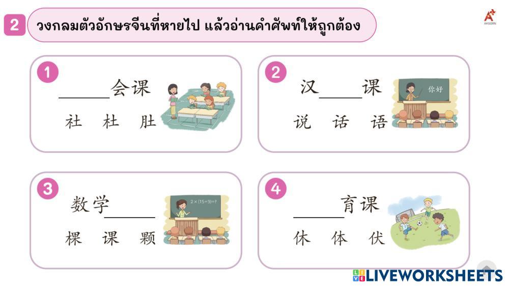 Created byThamonwan Suttikaroon ESL Chinese, Simplified A1 Writing Thai Author's Instructions 汉字 My Google Classroom Courses × 0 classes selected (0 students total) Quick Access Select all classes (0 classes) All Classes Loading courses... Cancel Share Share to selected Course __COURSE_NAME__ __STUDENT_NAME__ (__STUDENT_EMAIL__) ใบงานที่ 9.8 #ASK3 Download Worksheet Validation Check my answers Emails my answers to my teacher Full name Group/level School subject Teacher's email or key code Close Submit Validating worksheet... (12) Your answers have been sent to your teacher. Good luck! OK We encountered an error submitting your answers. Please try again. OK Advertisement | Go Ad Free Created byThamonwan Suttikaroon ESL Chinese, Simplified A1 Writing Thai Author's Instructions 汉字 Explore Worksheets Bahasa Cina Tahun 2 (Unit 1) ESL A1 Bahasa Cina Tahun 2 (Unit 1) Writing - ESL Sila jawab semua soalan. Typing Exercise ESL A1 Typing Exercise Writing - ESL Type the Chinese characters correctly, no space between the characters and make sure to use the correct punctuation 5 4-1 W 我会打篮球 ESL A1 5 4-1 W 我会打篮球 Writing - ESL 1. Baca petunjuk dengan teliti 2. Kerjakan latihan dengan serius 3. Tekan tombol 'Finish' jika sudah selesai 4. Jika nilai kurang dari 6, tekan tombol 'Repeat Exercise' 6 5-2 W 我现在很高兴 ESL A1 6 5-2 W 我现在很高兴 Writing - ESL 1. Baca petunjuk dengan teliti 2. Kerjakan latihan dengan serius 3. Tekan tombol 'Finish' jika sudah selesai 4. Jika nilai kurang dari 6, tekan tombol 'Repeat Exercise'